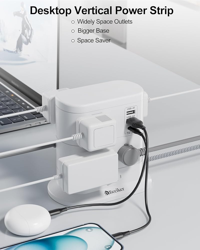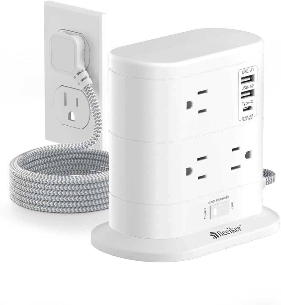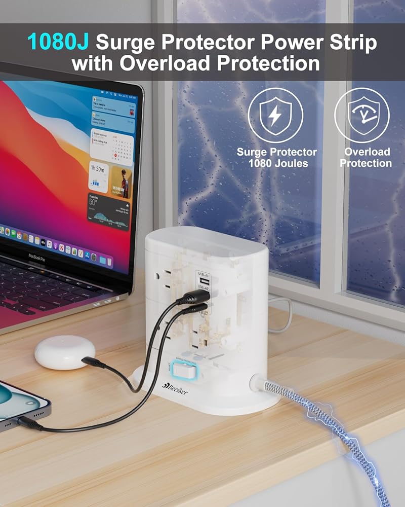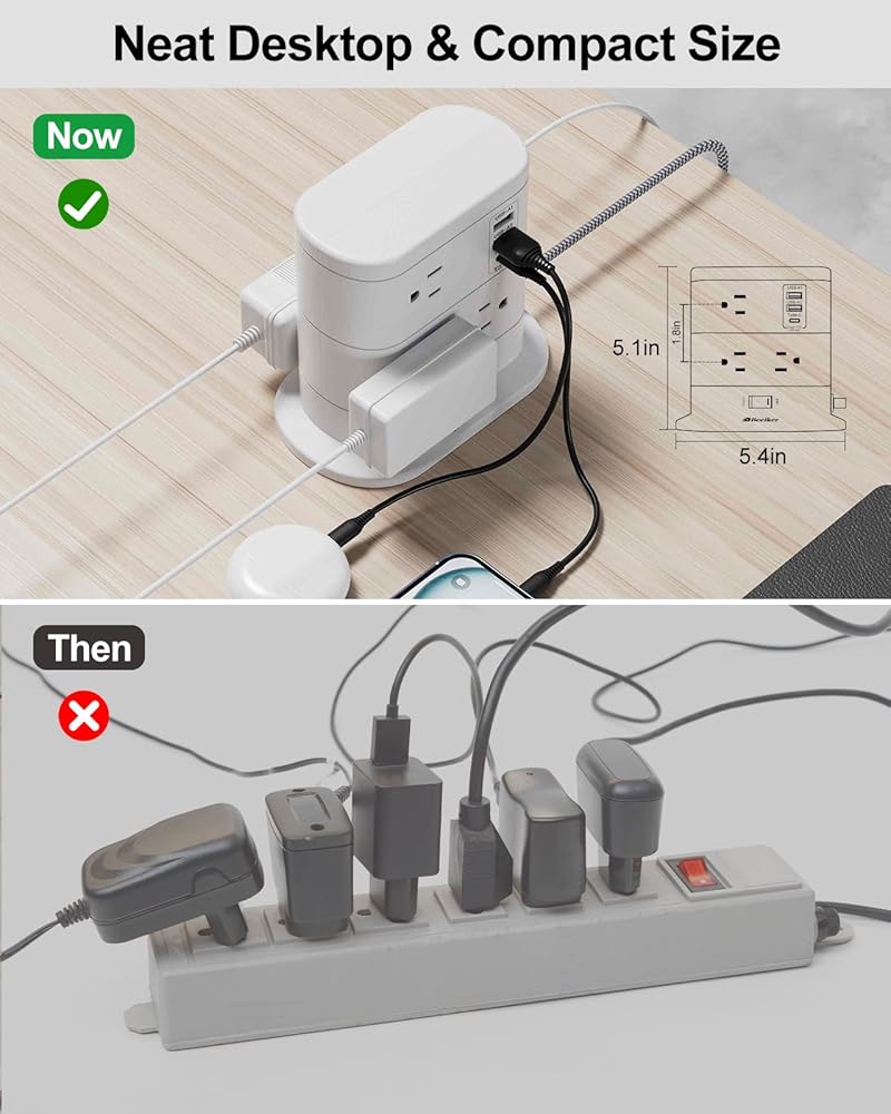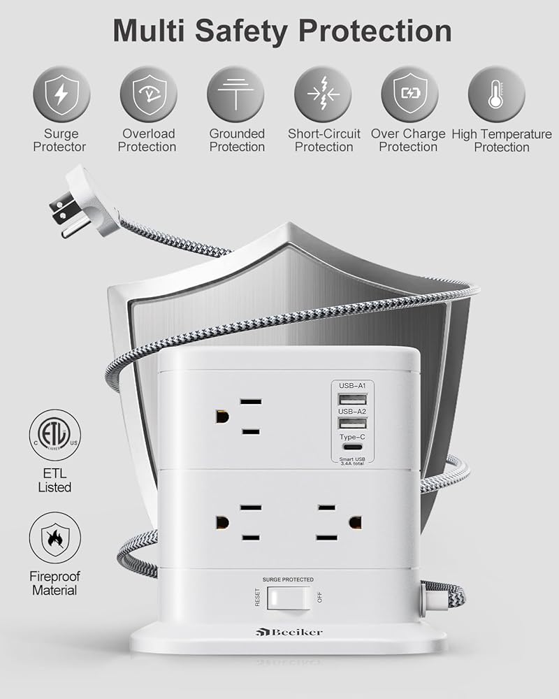 【حماية من زيادة التيار 1080 جول وحماية من التحميل الزائد】 تصنيف حماية من زيادة التيار 1080J للحفاظ على إلكترونياتك وأجهزتك المحمولة محمية من طفرات الجهد الكهربي. مفتاح تشغيل/إيقاف مضاء مع قاطع دائرة متكامل لحماية التحميل الزائد لجميع المنافذ ومنافذ USB. منظمات وإكسسوارات مكتبية آمنة.