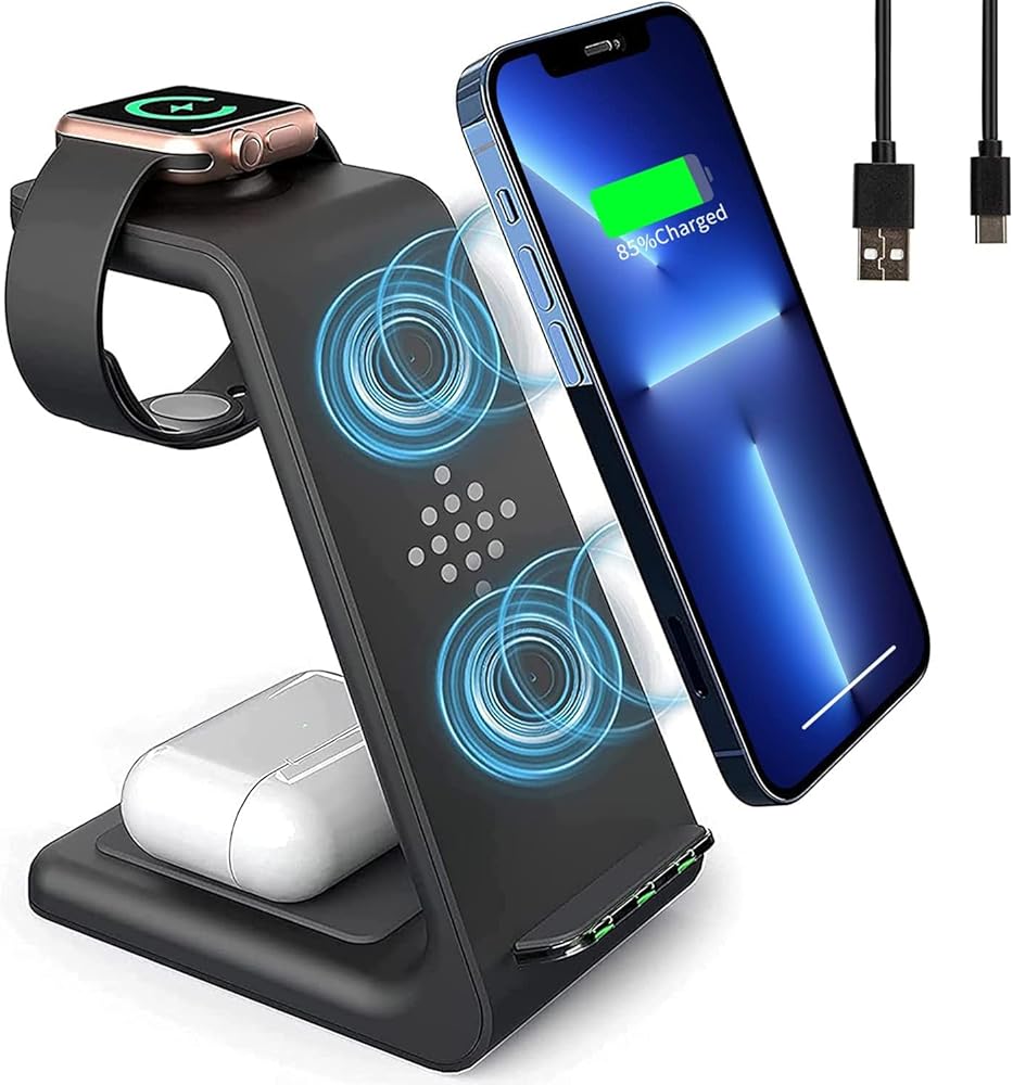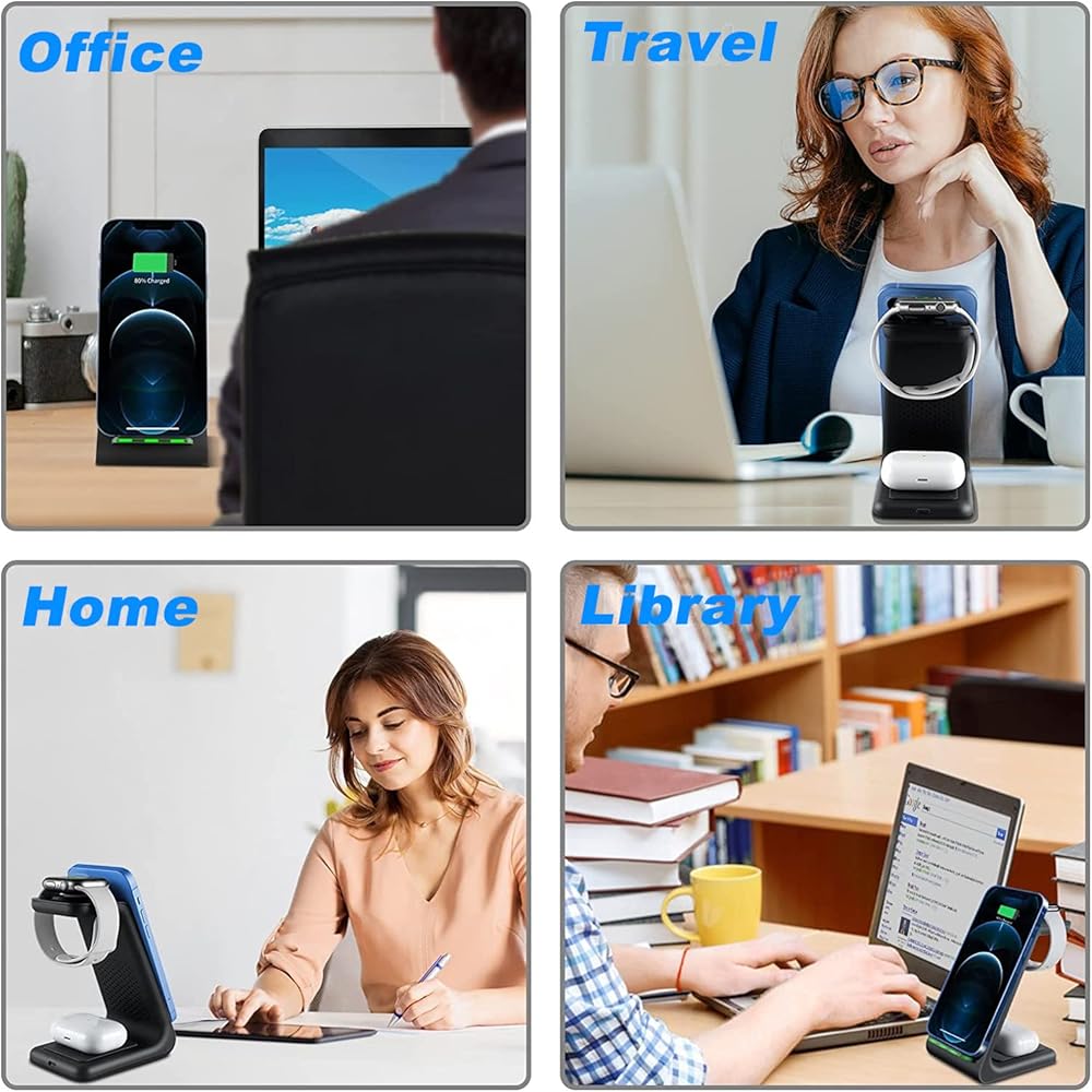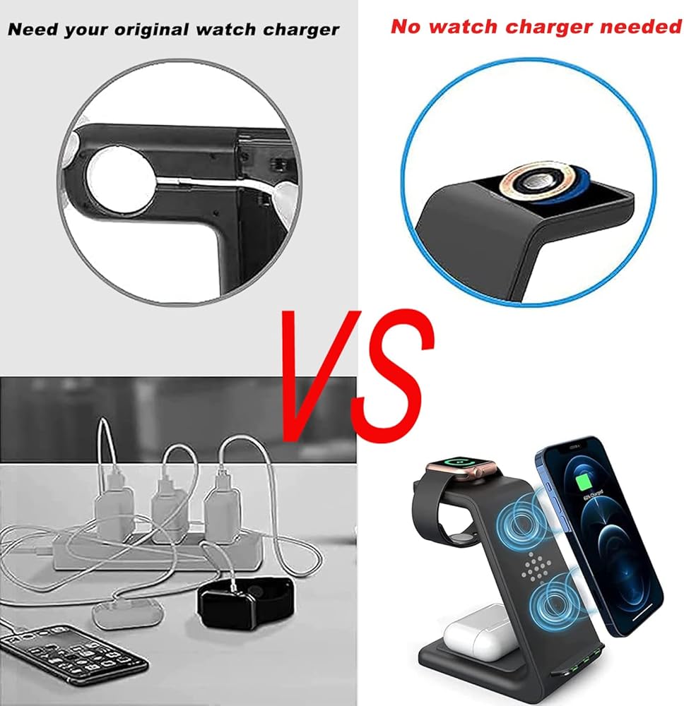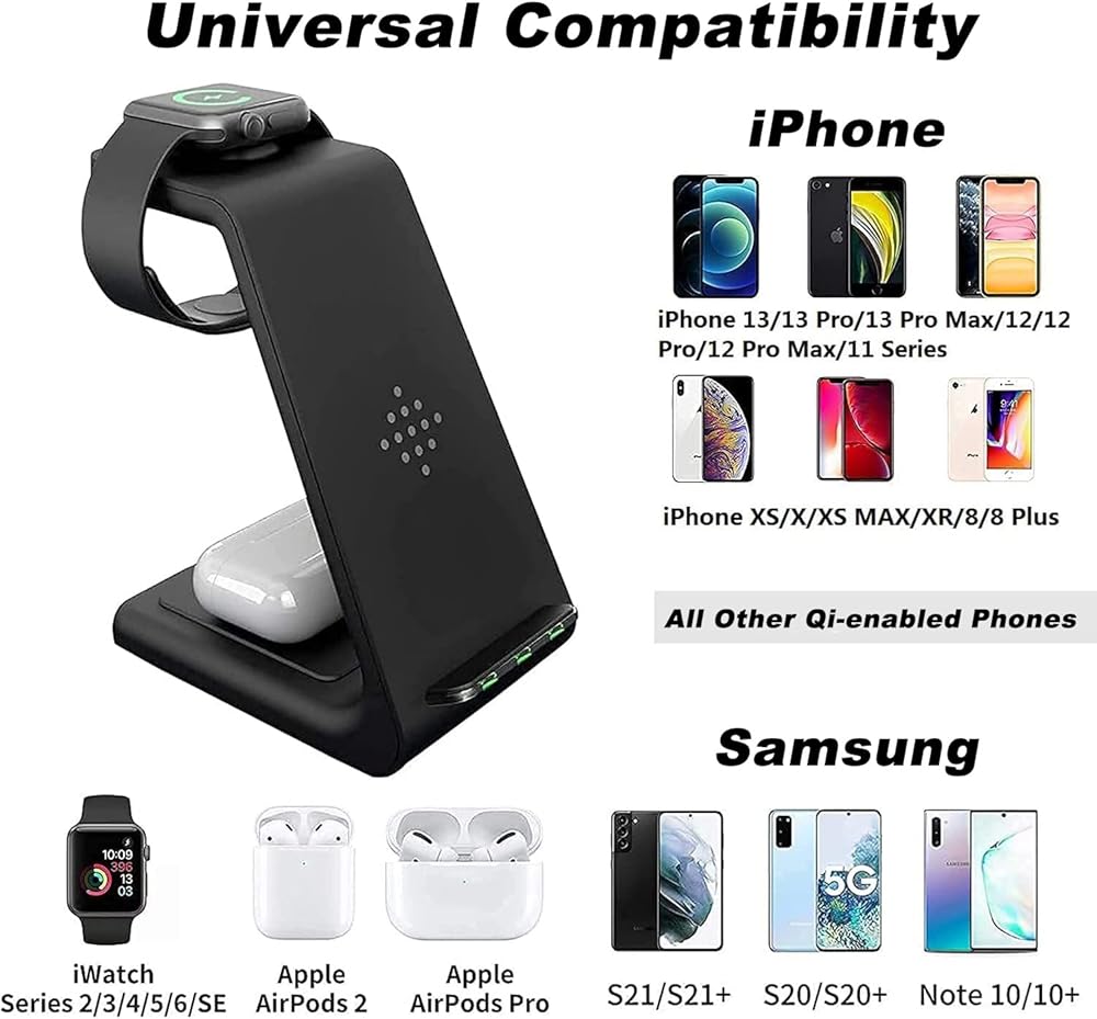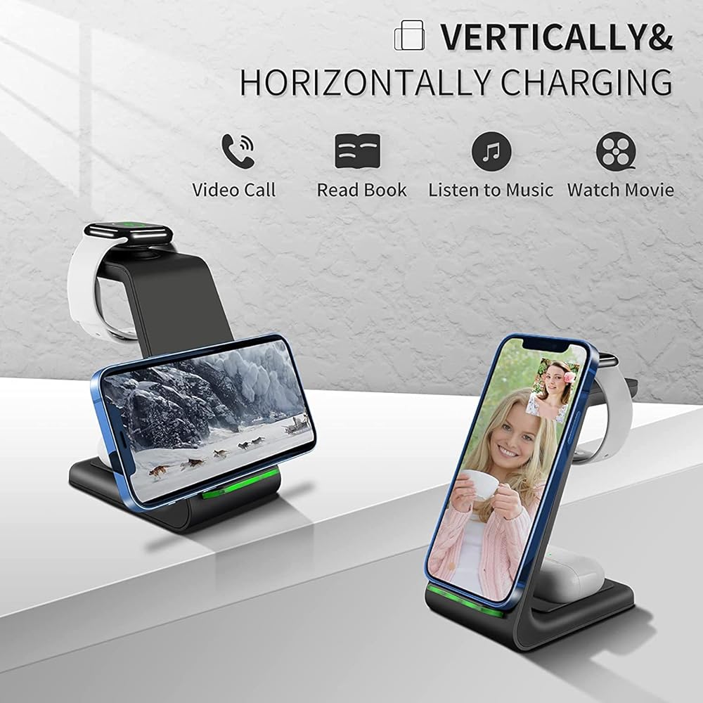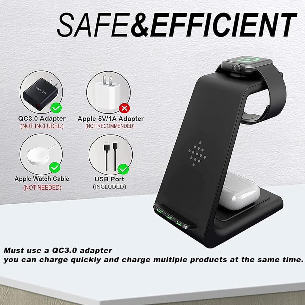 【محطة شحن 3 في 1 لأجهزة متعددة】يمكن لمحطة الشحن اللاسلكية هذه شحن الهاتف 13 / 13 Pro / 13 Pro max / 12 / 12 Pro / 12 Pro max / 11 / 11 Pro max / SE / X / XR / XS / xsmax / 8 بلس، بودز برو / 2 والمزيد من السماعات الداعمة لتقنية Qi. شاحن الساعة، مناسب لشحن الساعة Se / 6 / 5 / 4 / 3 / 2. قل وداعًا للأسلاك الفوضوية، واجعل مكتبك وطاولة السرير الجانبية أنيقة ومنظمة. للحصول على تجربة شحن أفضل، يرجى استخدام محول الطاقة 3.0 للشحن السريع.