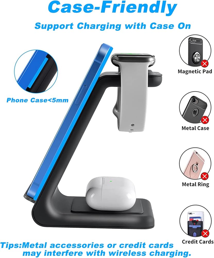 【تصميم صديق للحافظة وملف شحن مزدوج】تدعم محطة الشحن هذه الشحن (المطاط / البلاستيك / TPU بسمك أقل من 5 مم / 0.2 بوصة فقط). وفر عناء إزالة جراب الهاتف. يرجى إزالة الملحقات المعدنية أو المغناطيسية. يعمل ملف الشحن المزدوج على تحسين سرعة الشحن ويزيل مشكلة العثور على "أفضل موضع".