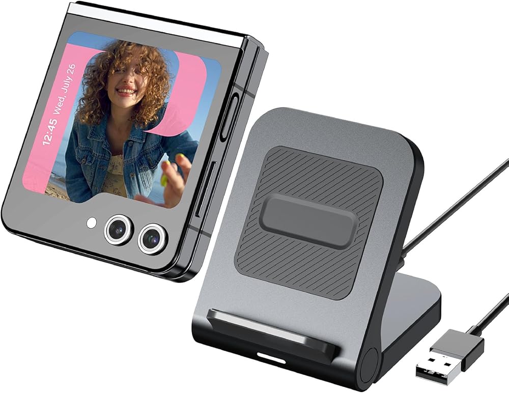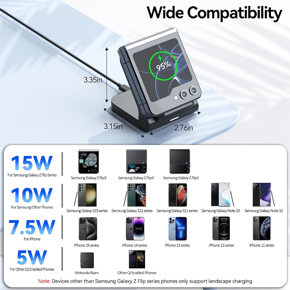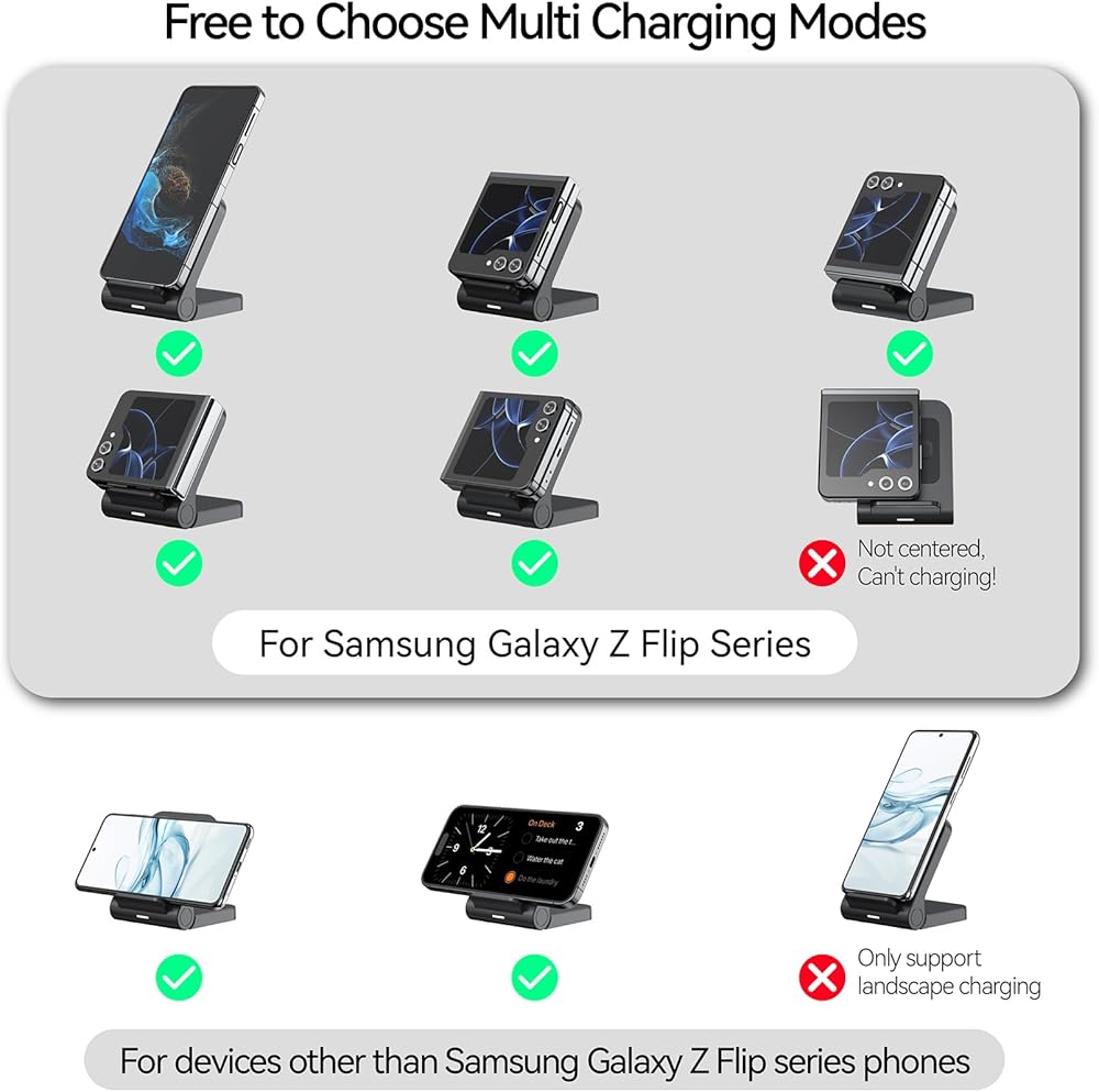【توافق واسع】هذا الشاحن القلاب مصمم لهاتف Samsung Z Flip 5/4/3، ولكنه متوافق أيضًا مع Samsung Galaxy S23/S23+/S23 Ultra/S22/S22+/S22 Ultra/S21/S21+/S21 Ultra/Note 20 /10، شاحن آيفون 15/بلس/برو/برو ماكس/آيفون 14/بلس/برو/برو ماكس/آيفون 13/ميني/برو/برو ماكس/آيفون 12/ميني/برو/برو ماكس/آيفون 11/برو/ Pro Max، 5W لجهاز Motorola Razr+ (ملاحظة: الأجهزة الأخرى غير هواتف سلسلة Samsung Galaxy Z Flip تدعم الشحن الأفقي فقط)