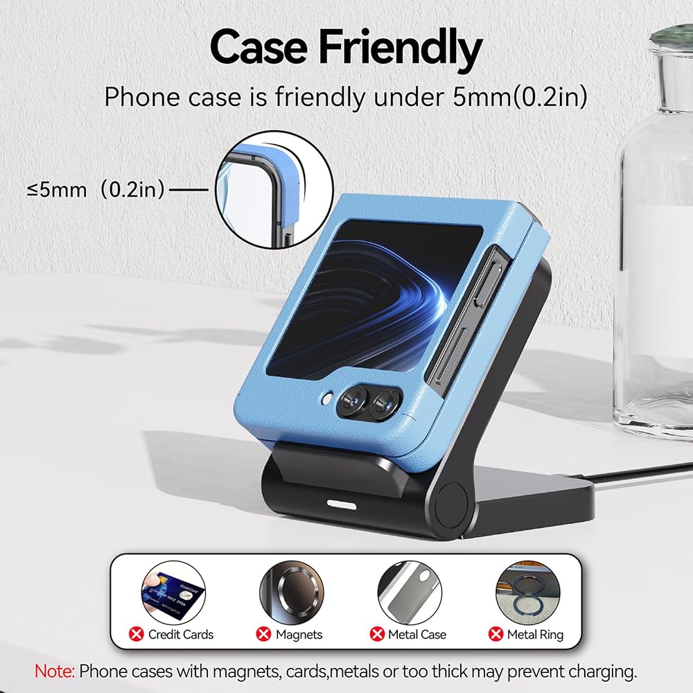 【تصميم صديق للحافظة】شاحن galaxy z flip 5 متوافق مع حافظات الهاتف بسمك 5 مم، غير متوافق مع الجرابات التي تحتوي على عناصر تعيق الشحن اللاسلكي، مثل الملحقات المعدنية أو المفاتيح. إذا لم يكن الشحن ممكنًا، فيرجى التحقق من تداخل الجراب