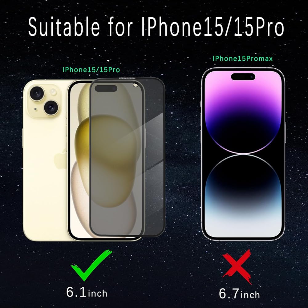 واقي شاشة للخصوصية من Yetaida متوافق مع iPhone 15 & 15 Pro مقاس 6.1 بوصة، واقي شاشة من الزجاج المقوى عالي الدقة بصلابة 9H ومضاد للتجسس ومضاد للوهج، سهل التركيب وصديق للحافظة، أسود