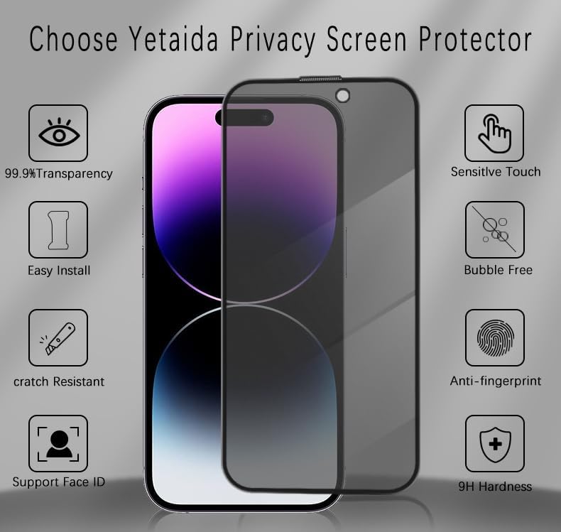 • واقي شاشة الخصوصية لهاتف iPhone 15/15 Pro: احم خصوصيتك مع واقي الشاشة المضاد للتجسس من Yetaida لهاتف iPhone 15 و15 Pro. استخدم هاتفك بثقة في الأماكن العامة أو في الداخل دون القلق بشأن تعرض معلوماتك الخاصة للخطر من أعين المتطفلين.