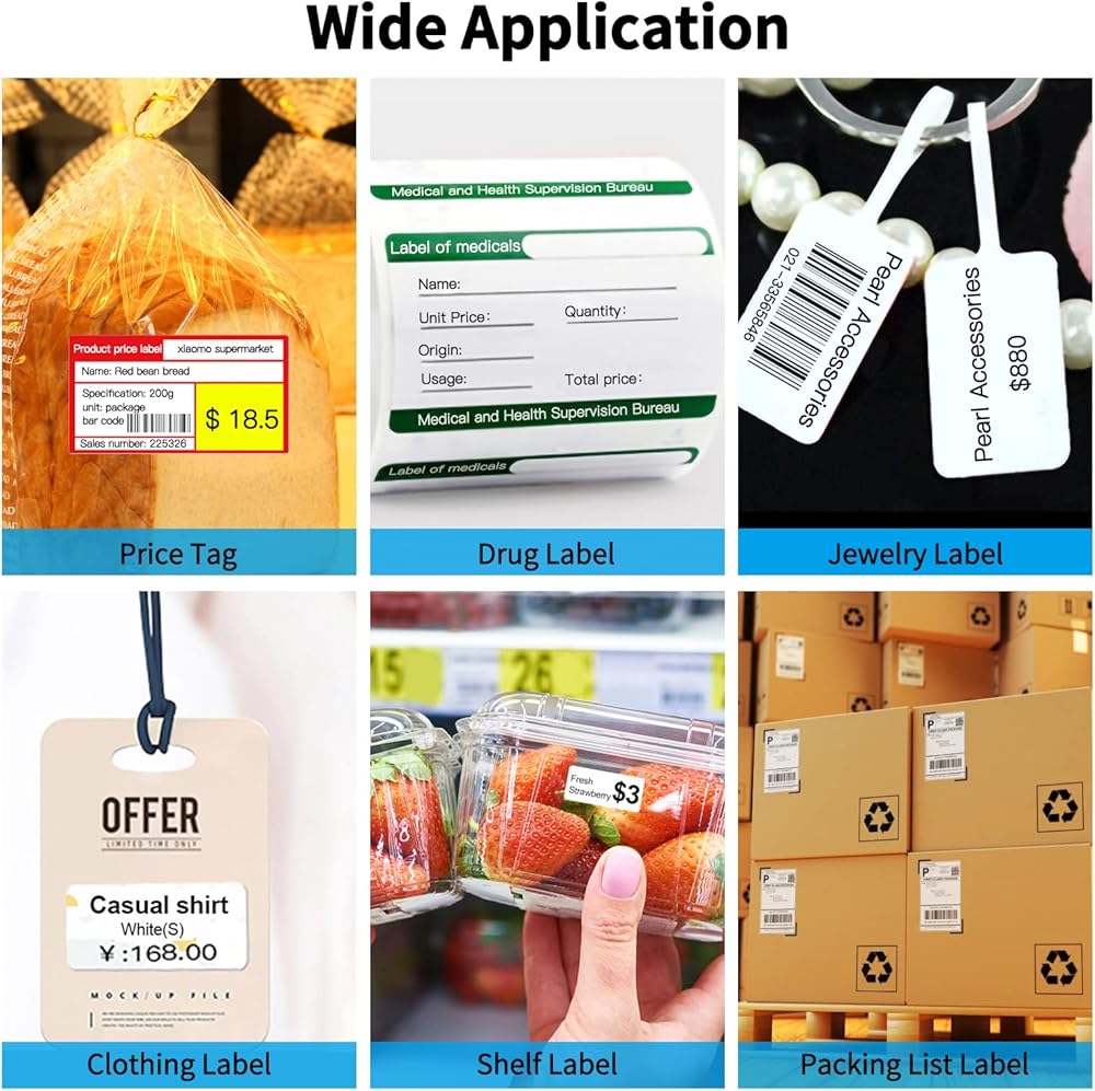💜 محمولة وخفيفة الوزن، ومريحة للحمل، ولا تحتاج إلى مساحة كبيرة. تستخدم على نطاق واسع في تجارة التجزئة التجارية، طباعة ملصقات المستودعات، السعر، ملصق المجوهرات، ملصق الرف، ملصق قائمة التعبئة، ملصق الأدوية، إلخ.