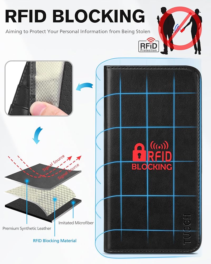 ✿✿حجب RFID✿✿ - يعمل تطبيق تقنية حجب RFID على حماية الإشارات بشكل فعال ويحافظ على معلوماتك الشخصية آمنة. حافظة جلدية لهاتف iPhone 15 Pro من TUCCH مزودة بمادة حماية RFID والتي يمكنها حجب الإشارات وحماية بطاقات الائتمان الخاصة بك من عمليات المسح غير المصرح بها.