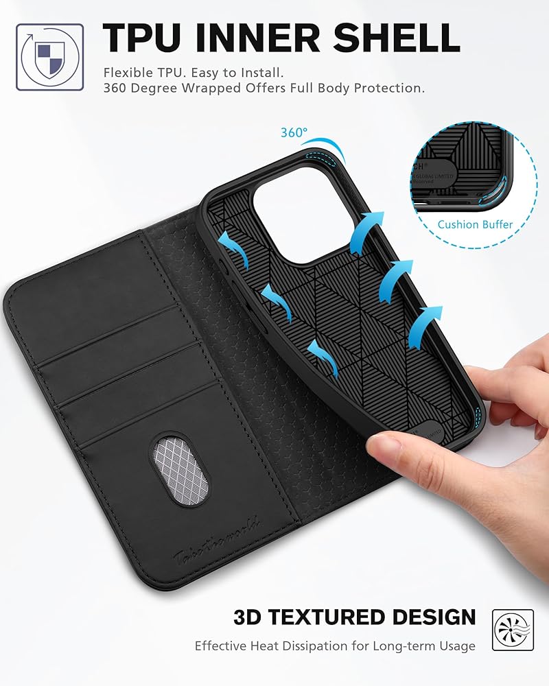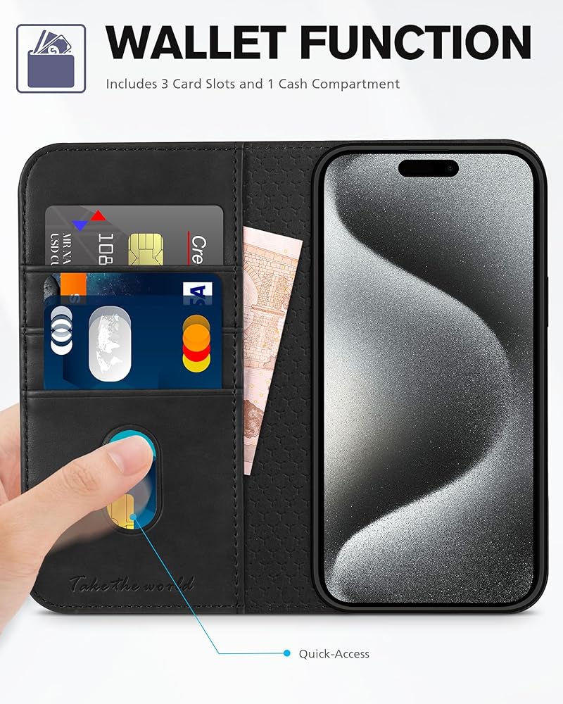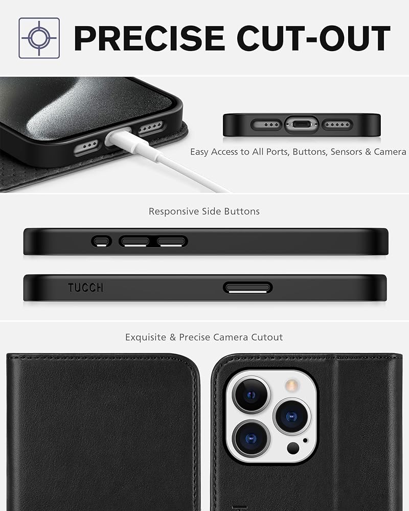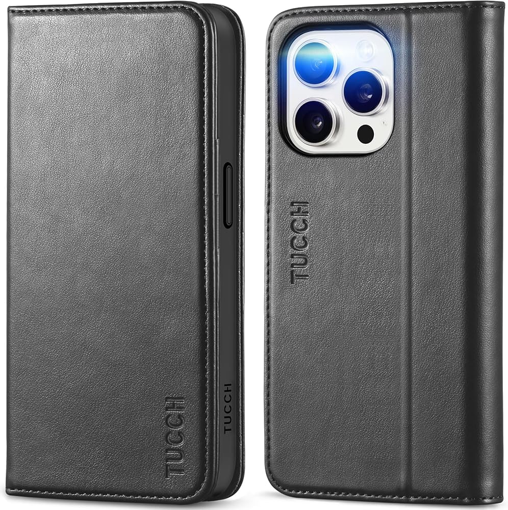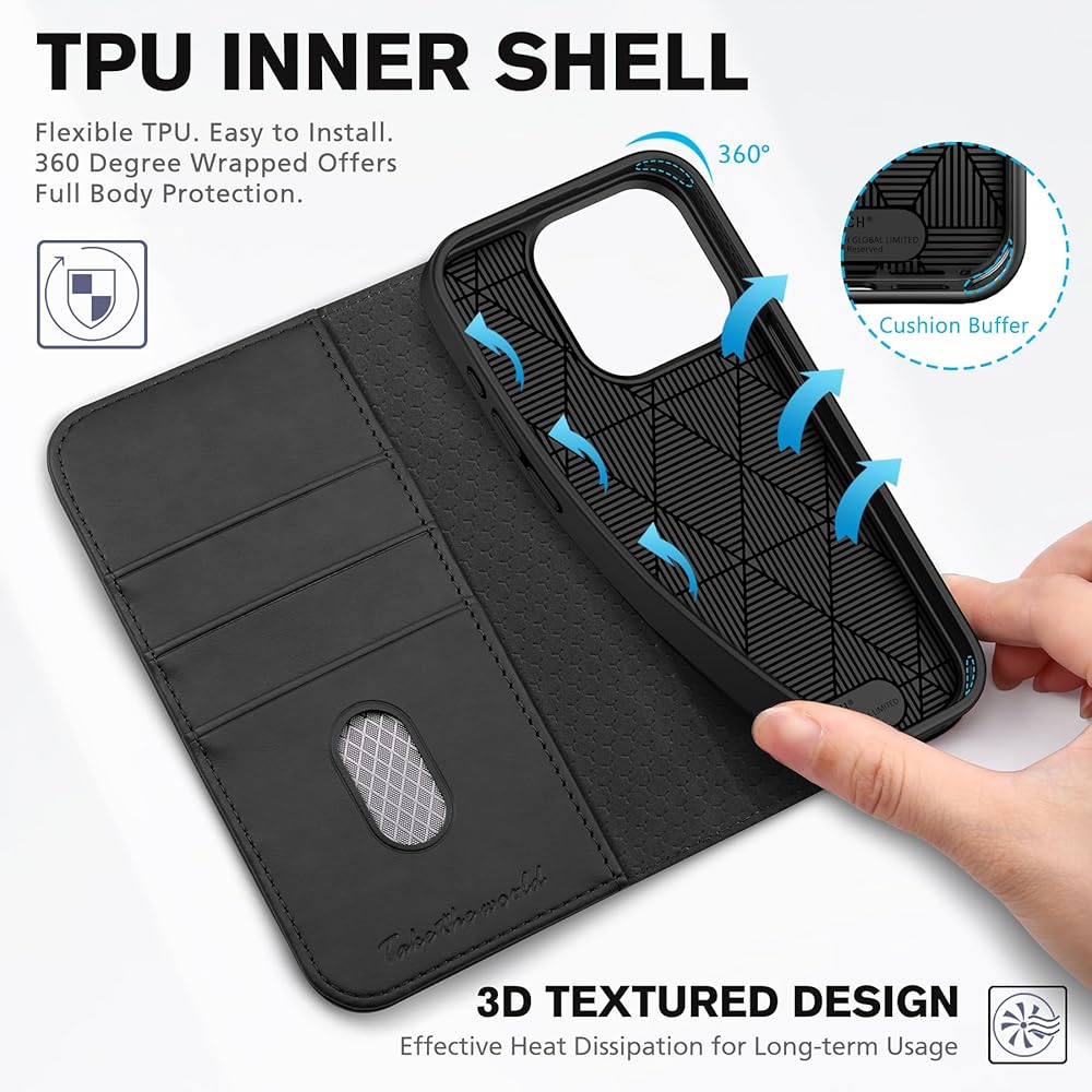محفظة TUCCH لهاتف iPhone 15 Pro 6.1 بوصة، غطاء واقٍ من جلد البولي يوريثان 3 فتحات للبطاقات، مسند RFID مع غطاء داخلي مقاوم للصدمات من مادة TPU متوافق مع iPhone 15 Pro 5G 2023، أسود كلاسيكي