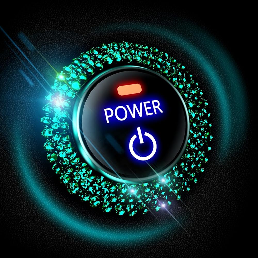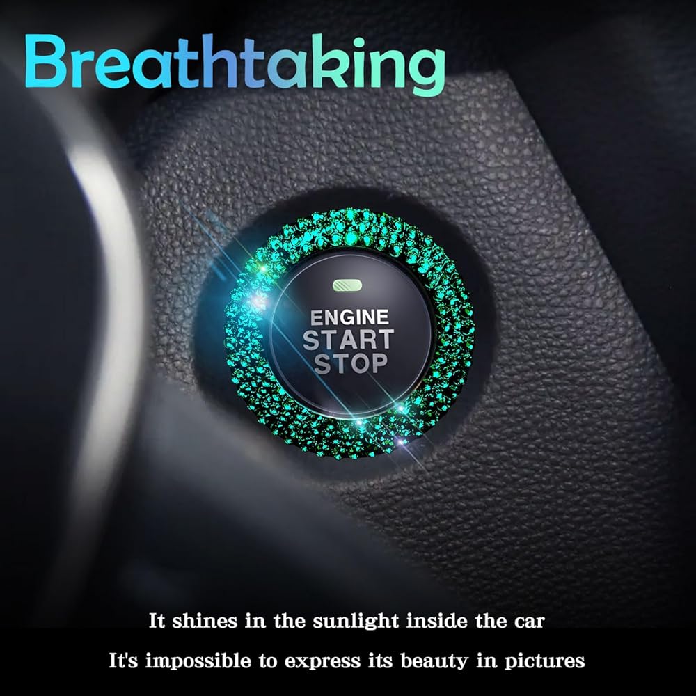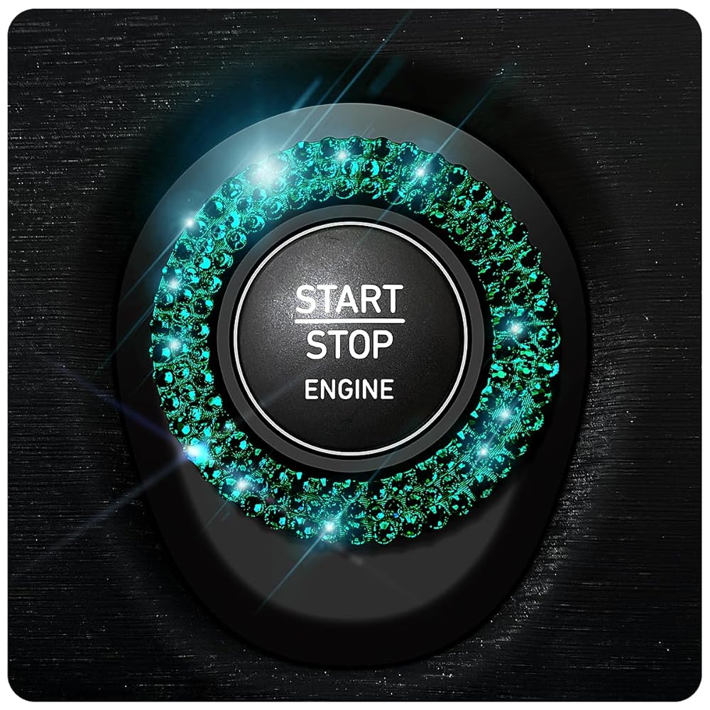 كريستال حجر الراين بلينغ سيارة دفع زر البداية غطاء / ملصق محرك بدء إيقاف الديكور حلقة بلينغ اكسسوارات السيارات للنساء مفتاح الإشعال ومقبض بلينغ حلقة أحجار الراين الخضراء