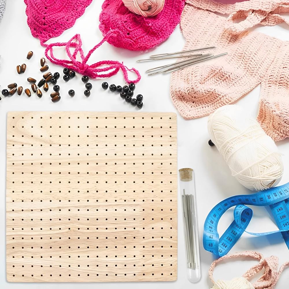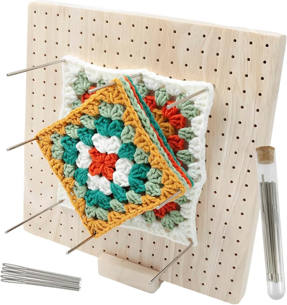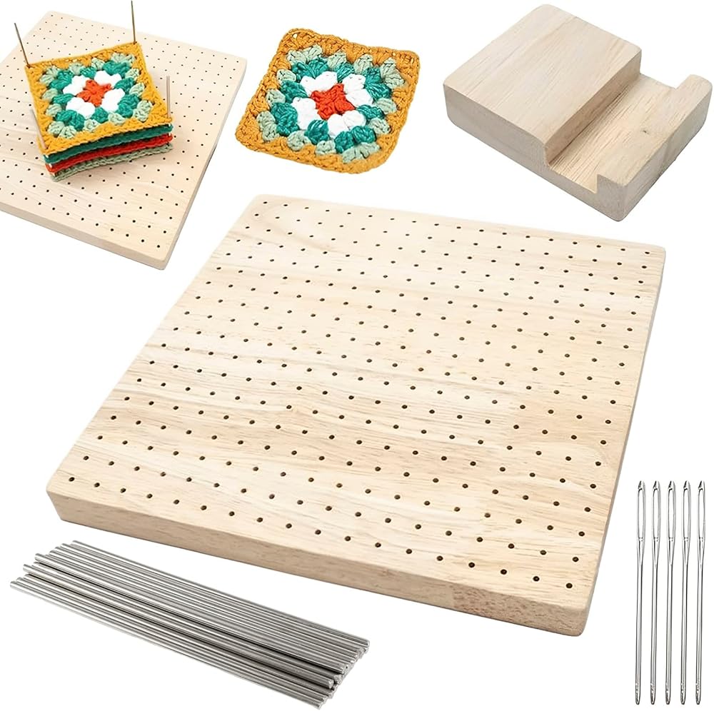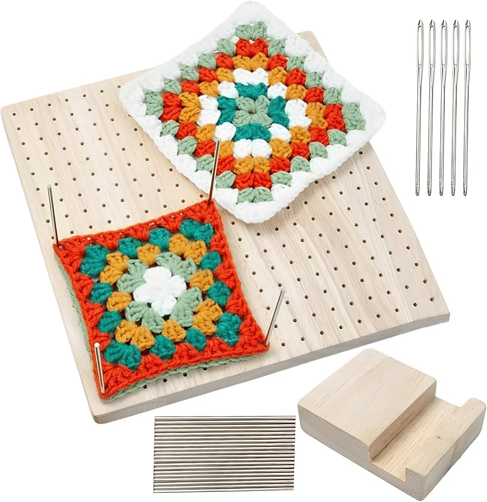 لوح لحجب الكروشيه مقاس 9.3 انش، حصائر ودبابيس خشبية لحجب الحياكة ومشاريع الكروشيه، مربعات الجدة، مجموعة كاملة مع 20 دبوس من الستانلس ستيل، 5 ابر عين كبيرة، حامل