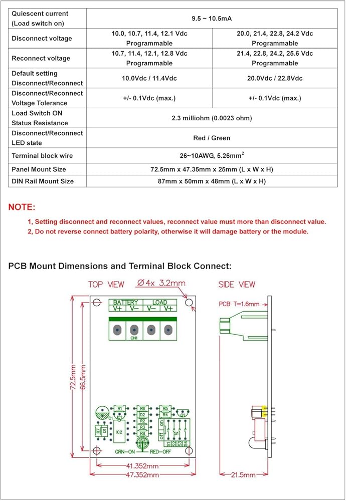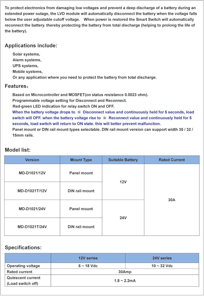 لحماية الإلكترونيات من الجهد الكهربائي المنخفض ومنع التفريغ العميق للبطارية أثناء انقطاع الطاقة الطويلة، ستقوم وحدة LVD بفصل البطارية تلقائيًا عندما يسقط الجهد أقل من جهد المستخدم القابل للتعديل. عند استعادة الطاقة، سيقوم المفتاح الذكي بإعادة توصيل البطارية تلقائيًا. وبالتالي حماية البطارية من التفريغ الكلي (يساعد على إطالة عمر البطارية).