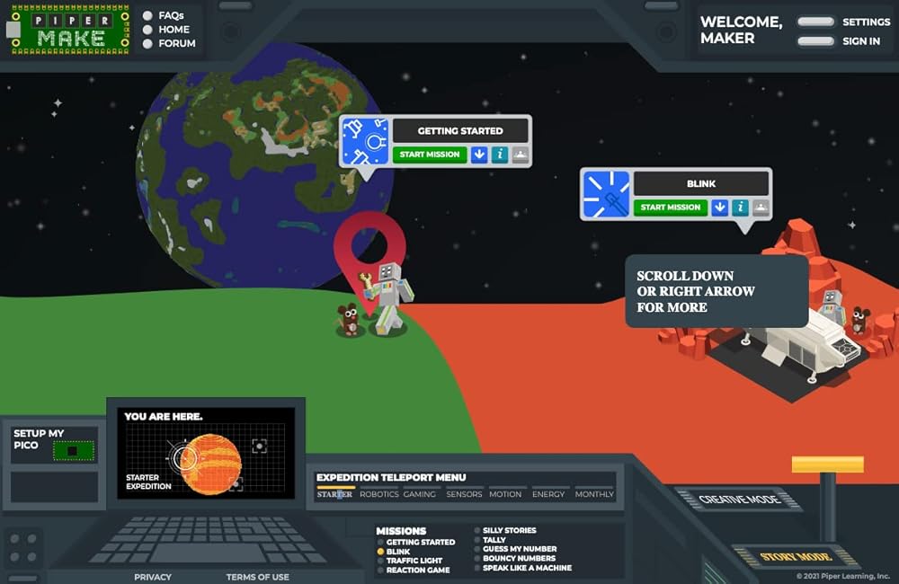 مع مجموعة ستارتر اكسبيديشن، ستتمكن من الوصول إلى 10 دروس ترميز ذاتية التوجيه مجانية على بايبر Make - بدءًا من وميض مصباح LED إلى صنع الموسيقى باستخدام المقاومات. في قصتنا، ساعد Piperbot و Pip على استكشاف المريخ، وستتعلم التفكير الحسابي والدوائر الأساسية وغير ذلك الكثير. تعرف على المزيد حول ما يمكنك القيام به مع مجموعة بايبر Make Starter Expedition مع دليل البدء السريع.