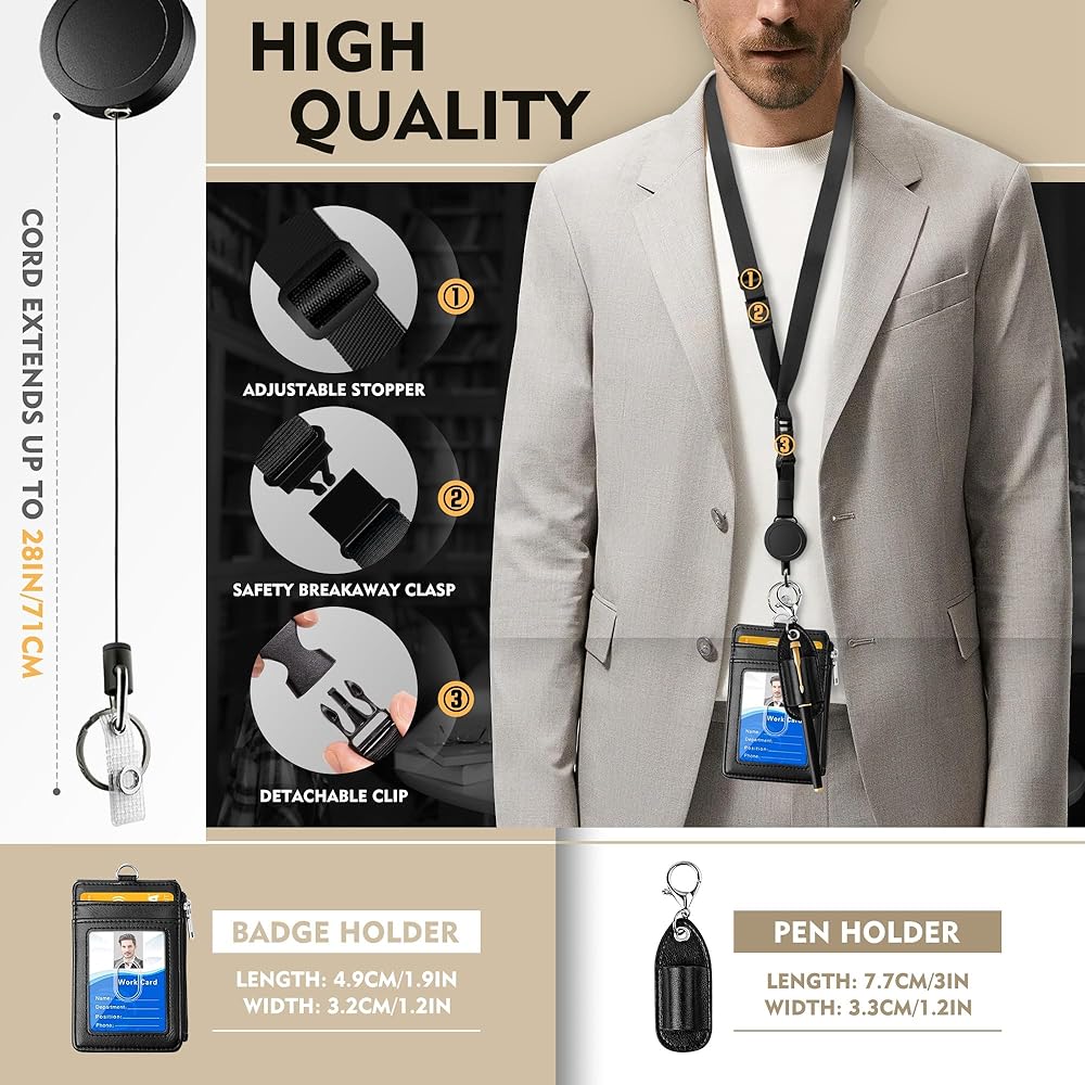 ELV Badge Holder with Zipper and Retractable Lanyard, PU Leather ID Badge Card Holder Wallet with 5 Card Slots, RFID Blocking Pocket, Adjustable Detachable Neck Lanyard with Keychain and Pen Holder