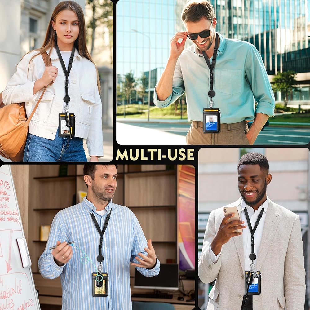 • PREMIUM QUALITY WITH EFFICIENCY - This ID holder is made with top quality PU leather which has reinforced sching to provide durability. The RFID blocking pocket is a great place to keep cash, a USB, different keys etc... The adjustable, detachable neck lanyard comes with a carabiner, key ring and has a safety clasp breakaway feature. The neck lanyard can offer convenience when needing to access various IDs or other cards during your day.