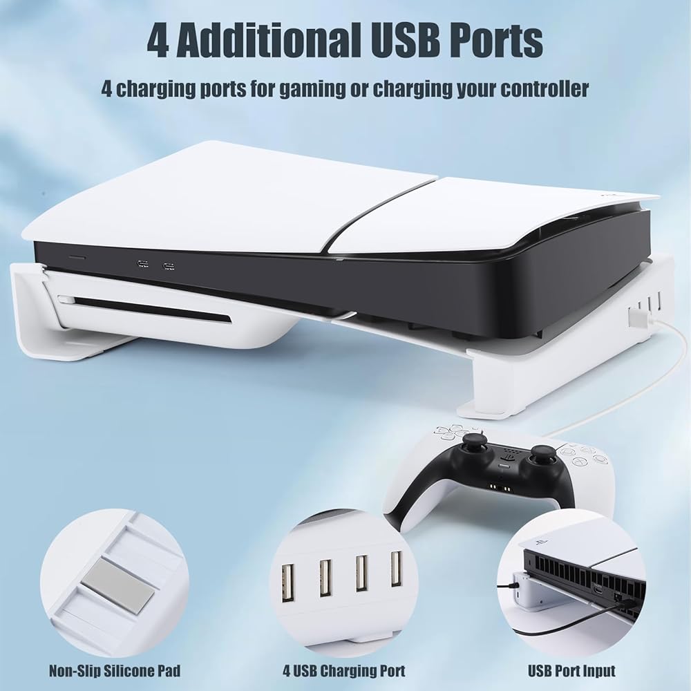 【1 USB-C and 4 USB-A Expansion Ports】Horizontal stand comes with 1 USB-C and 4 USB-A hubs. 4 USB 2.0 ports for data transfer and charging. NOTE: please connect rear USB port for PS5 Slim console to get always power supply.