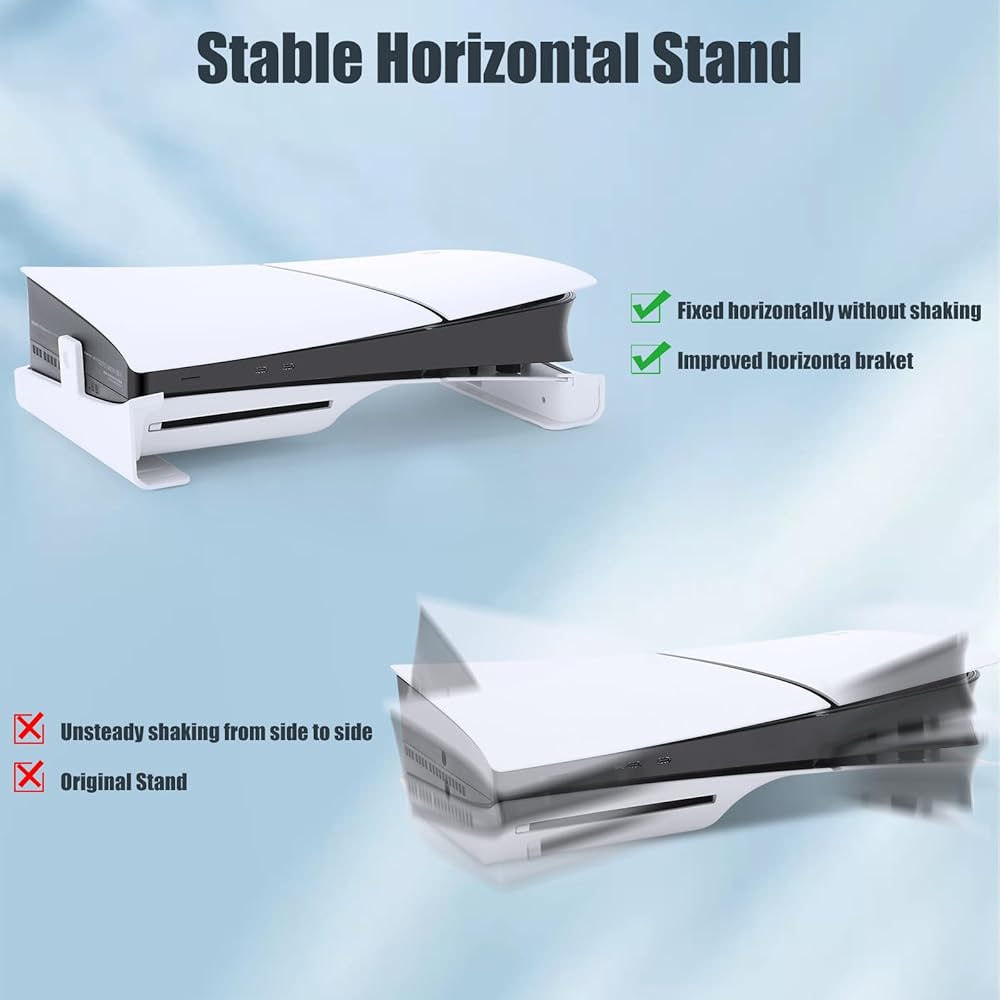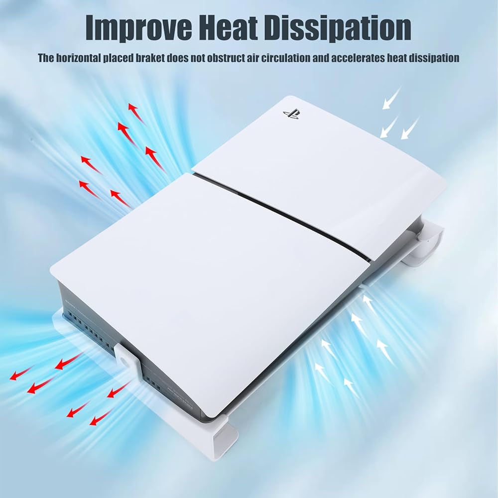 【Excellent Heat Dissipation Design】This stand holds the PS5 Slim console horizontally to increase the cooling area. The horizontal stand has a certain height that lifts the console up to provide enough space for air circulation, preventing the console from overheating during gaming and protecting the console.