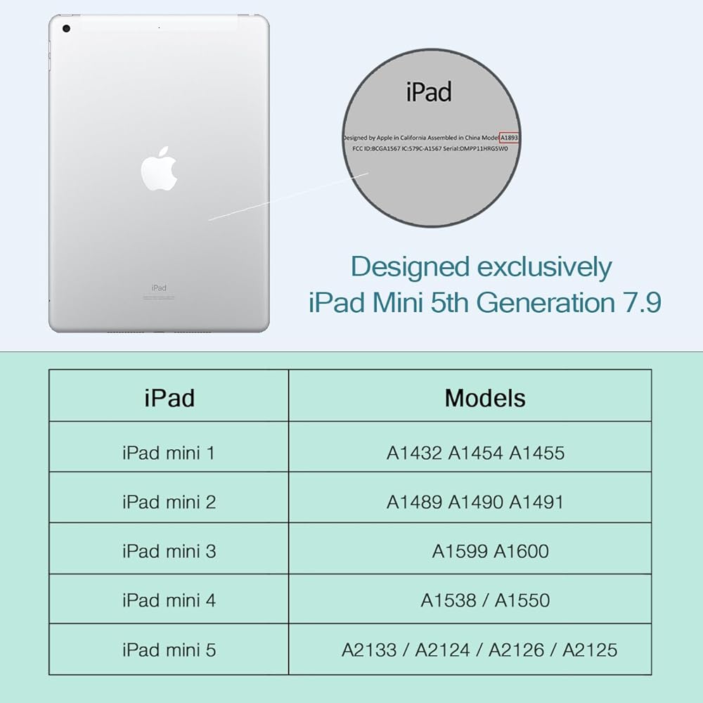 التوافق: مصمم حصريًا لجهاز iPad Mini الجيل الأول (A1432,A1454,A1455), iPad Mini الجيل الثاني (A1489,A1490,A1491), iPad Mini الجيل الثالث (A1599,A1600), iPad Mini الجيل الرابع (A1538,A1550), iPad Mini 5th(A2133,A2124,A2125,A2126) إصدار 2019. يرجى التحقق من أسفل جهاز iPad الخاص بك للعثور على رقم الطراز.