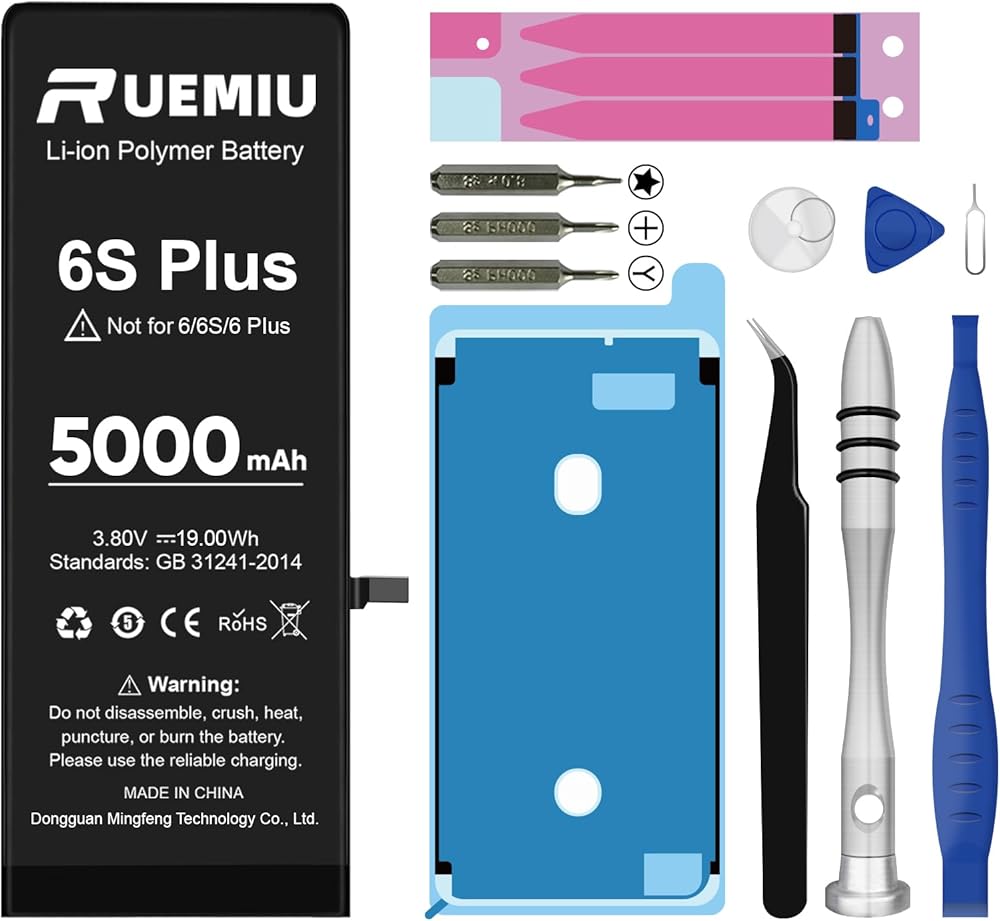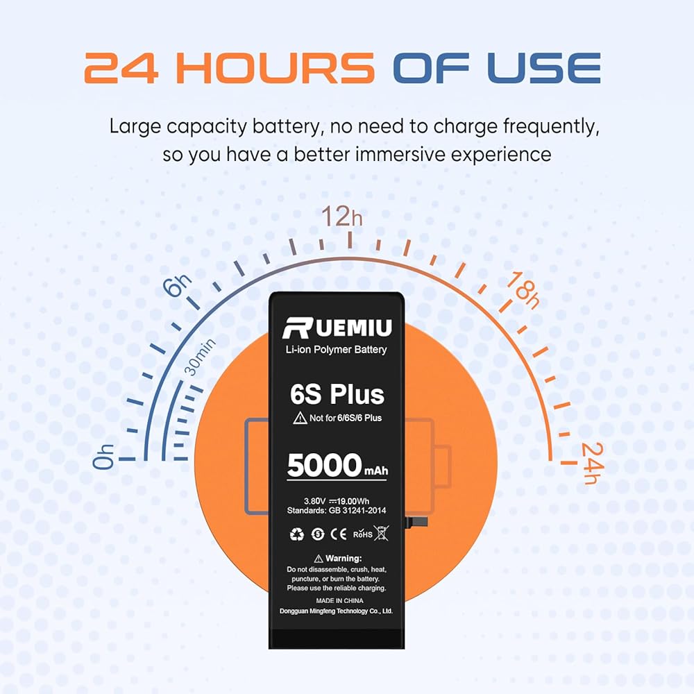 بطارية بديلة من RUEMIU لهاتف iPhone 6S Plus، 5000mah 2024 جديدة ذات سعة عالية مطورة لنماذج بطارية iPhone 6S Plus A1634 A1687 A1699 مع مجموعة أدوات إصلاح احترافية كاملة
