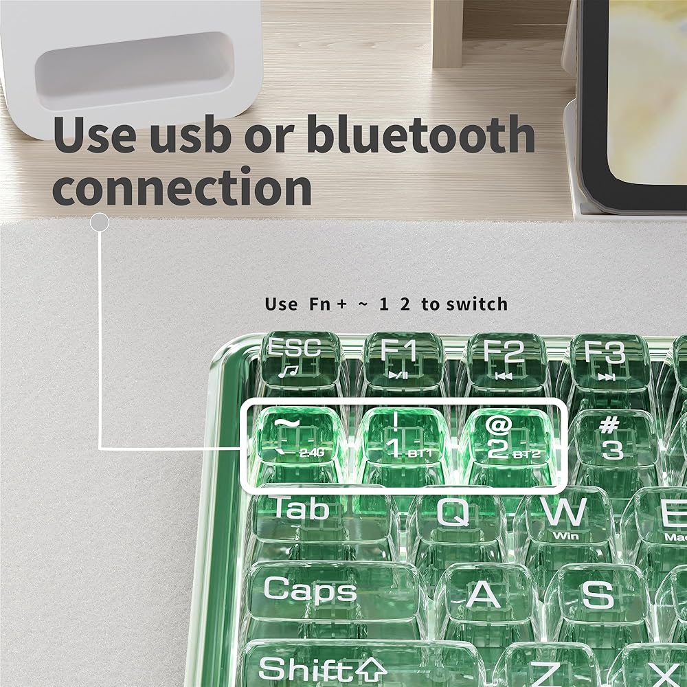 USB وبلوتوث 2.4 جيجا هرتز - قم بالتوصيل ثم التشغيل، اتصال مستقبل USB ثابت ومتين للوحة المفاتيح اللاسلكية. يمكنك أيضًا توصيله عن طريق الاقتران بالبلوتوث. يمكن أن يدعم 3 أجهزة في نفس الوقت، فقط قم بتغييره حسب رغبتك
