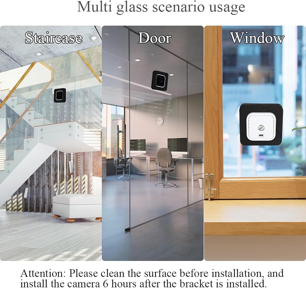 Easy to install: The camera adaptive flexible mounting bracket can be removed from the protective film and pasted onto the glass. Before installation, please ensure that the surface is clean and dry. After 6 hours of installation, place the camera.