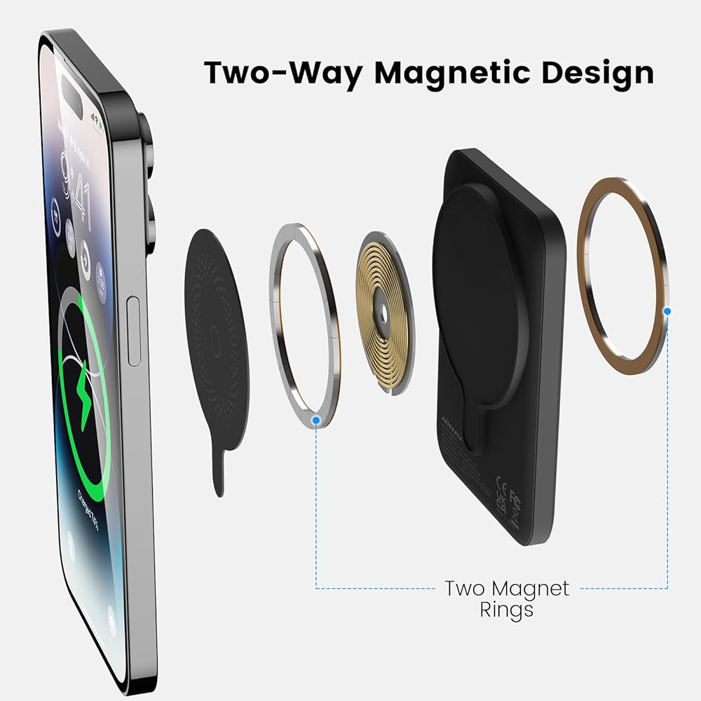 تصميم مغناطيسي مزدوج الجوانب - يتم توصيل أحد الجانبين بجهاز iPhone الخاص بك، بينما يتوافق الجانب الآخر مع مقبض الهاتف المغناطيسي ومحفظة MagSafe وحامل الحائط MagSafe، مما يسمح لك بالاستمتاع براحة MagSafe. ملحوظة: جانب واحد فقط مخصص للشحن اللاسلكي.