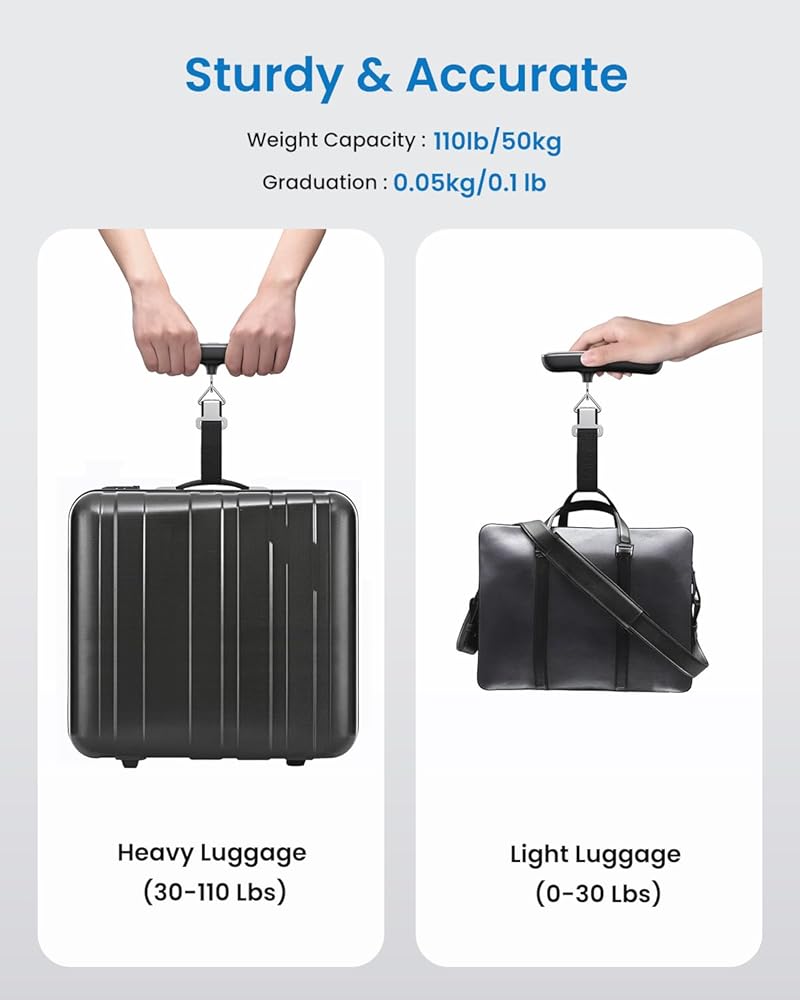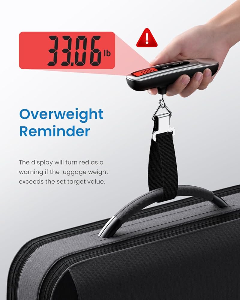Luggage scale - Overweight Reminder, Stress-Free: Bid farewell to packing guesswork! The digital luggage scale comes with a built-in overweight reminder that adds an extra layer of assurance. If your luggage weight exceeds your preset target value, the display instantly transforms into a vivid red warning.