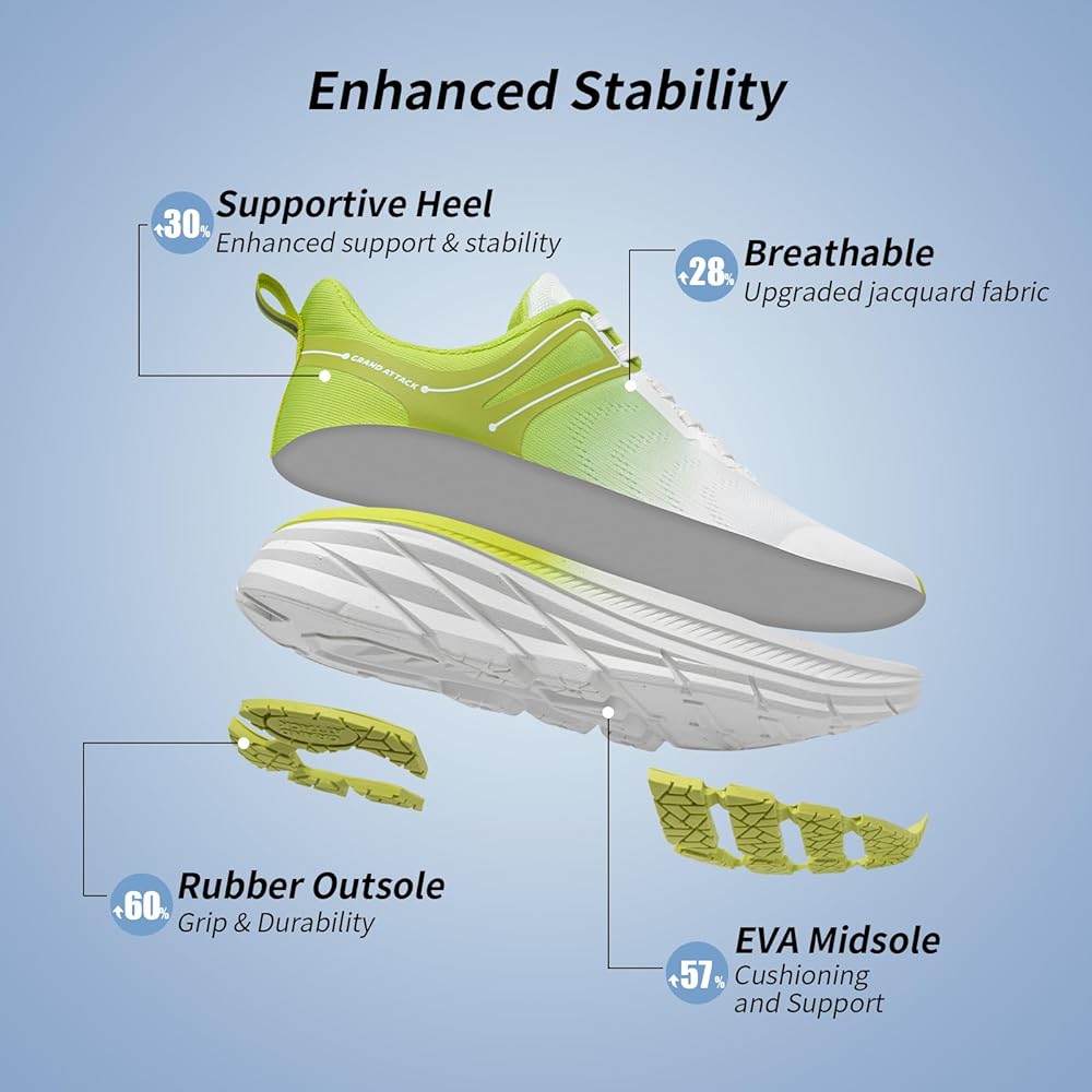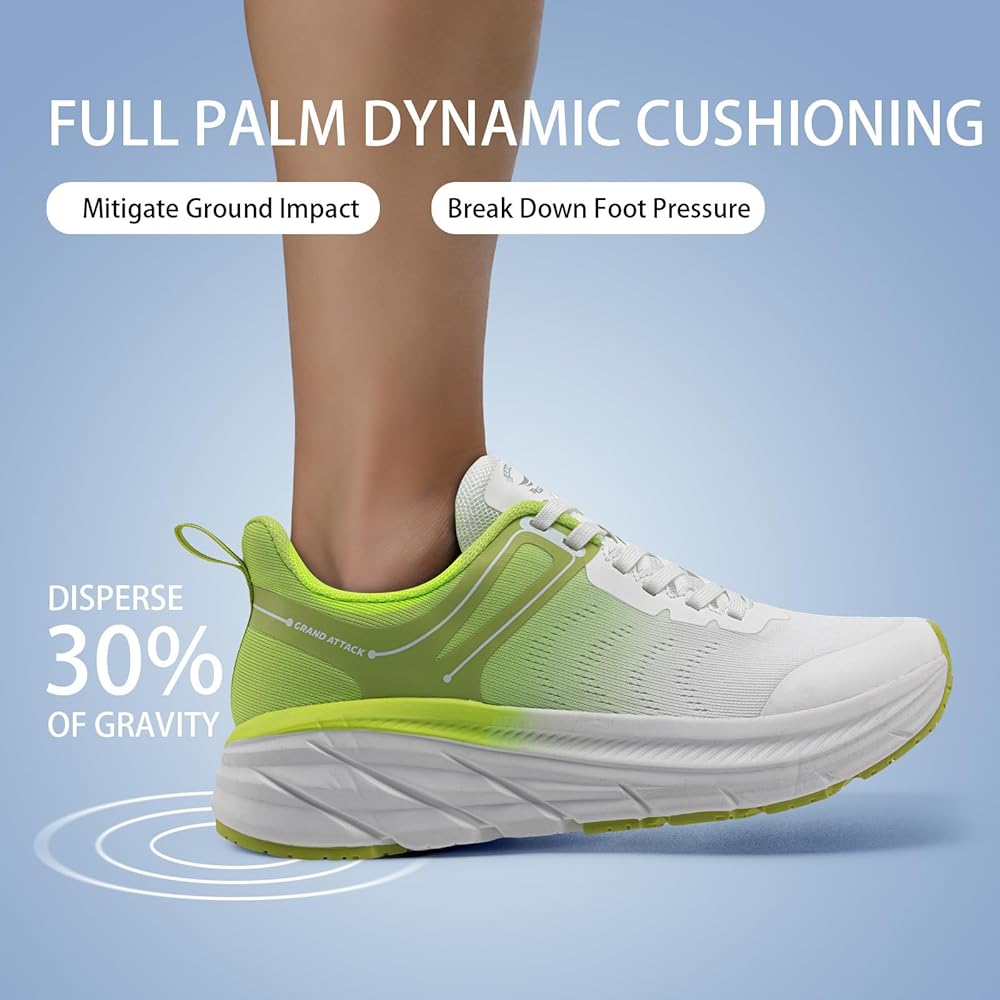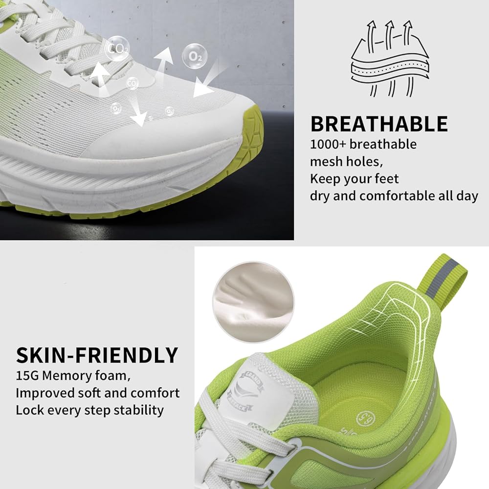 • 【توسيد فائق】: يستخدم النعل الأوسط EVA بسمك 4.5 سم تقنية رغوية أكثر تقدمًا لتحسين قوة التوسيد بين القدم والأرض بشكل كبير. سواء كنت تمشي لمسافات طويلة أو تقف طوال اليوم في العمل، فإن حذاء الجري النسائي هذا سيخفف الضغط على قدميك.
