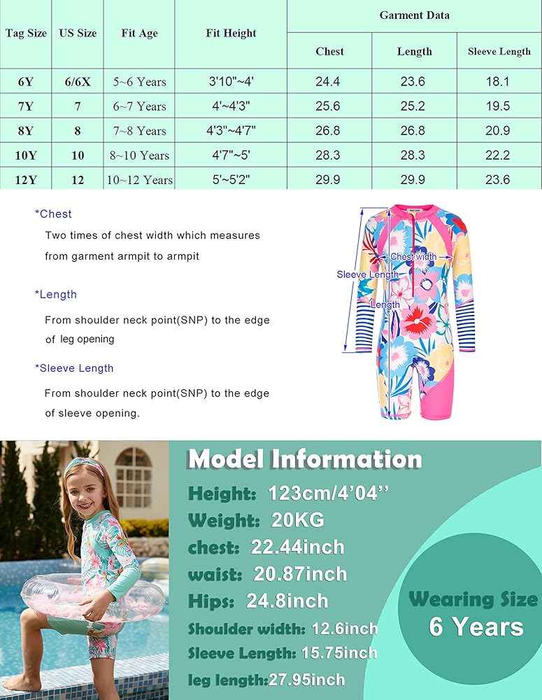 - 【تأكيد المقاس】ملابس السباحة الواقية من الطفح الجلدي للفتيات ستكون مريحة للغاية إذا اخترت المقاس الصحيح، يرجى التحقق من جدول المقاسات لاختيار المقاس المناسب لفتاتك قبل الشراء