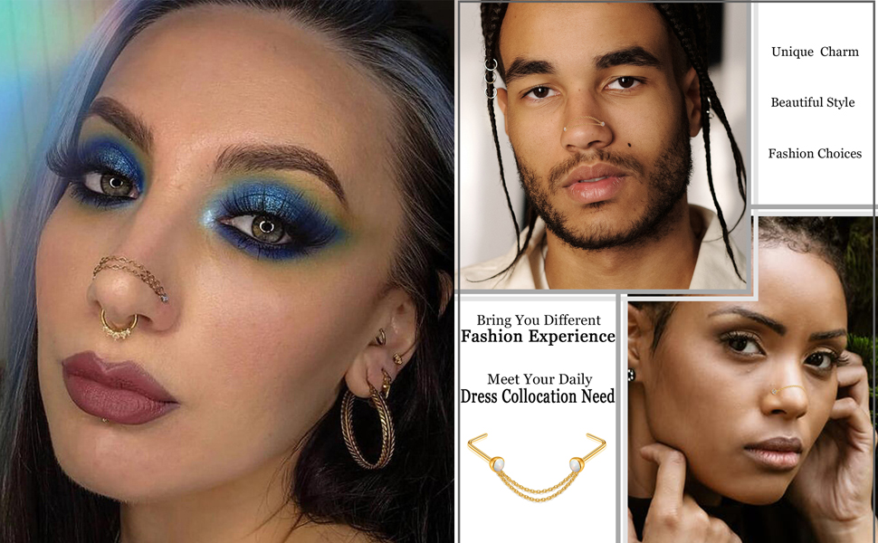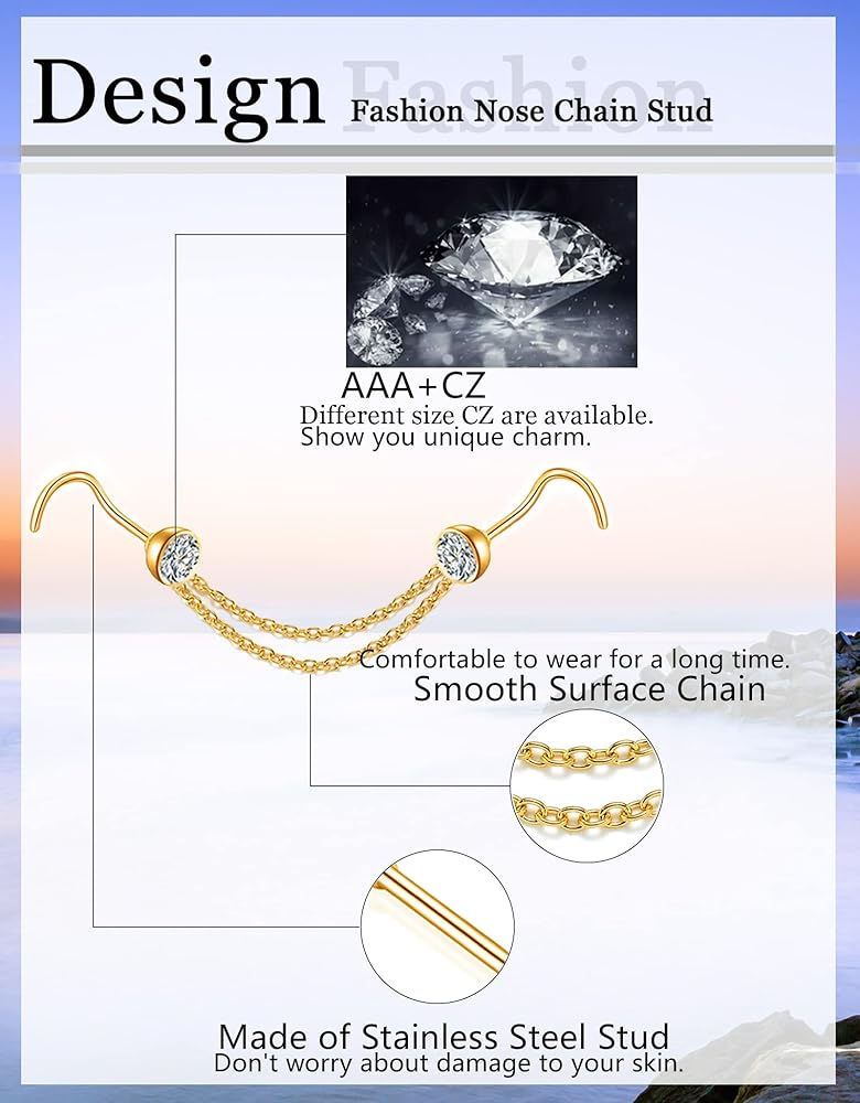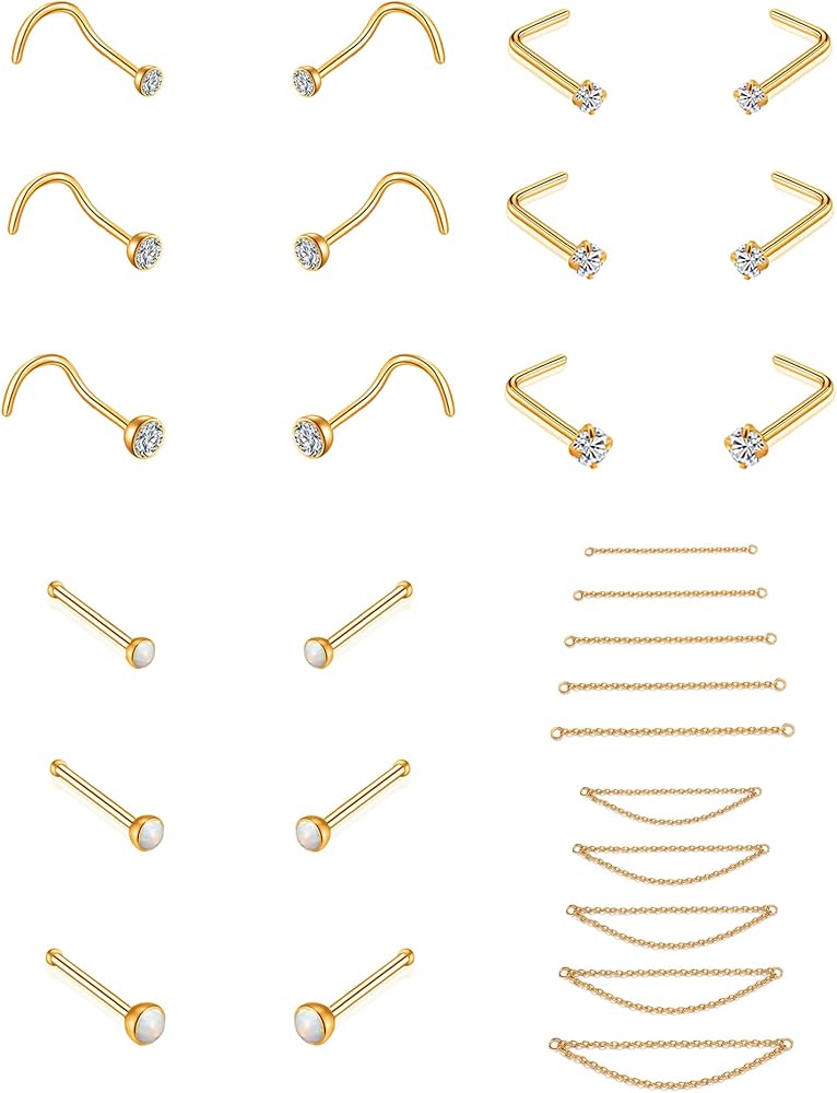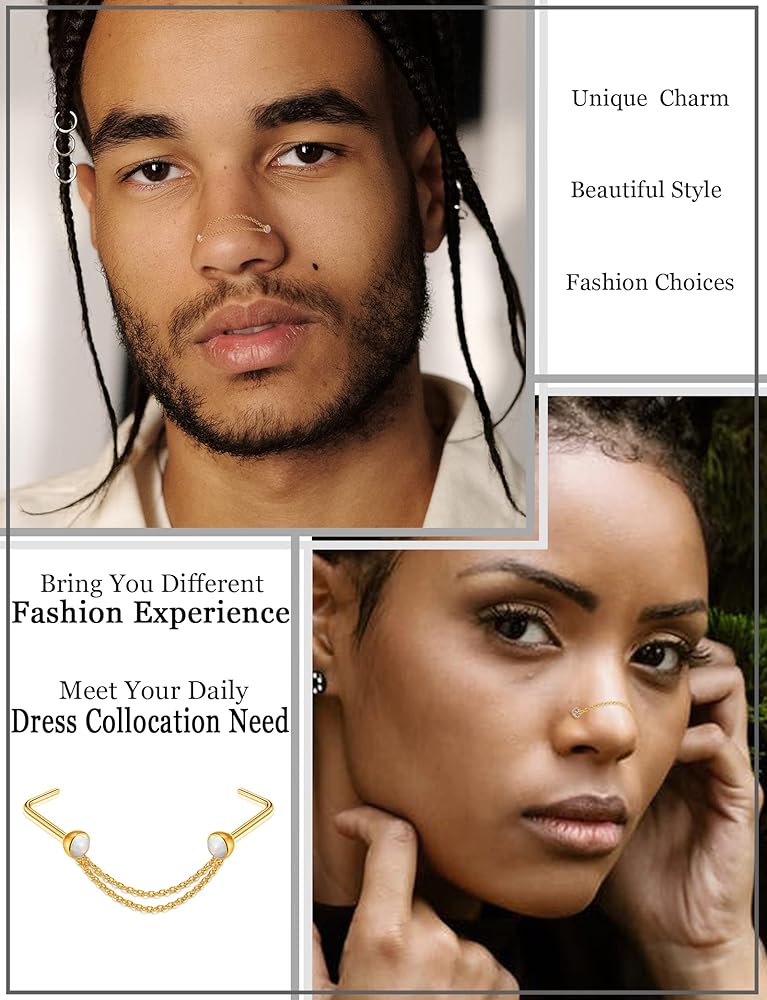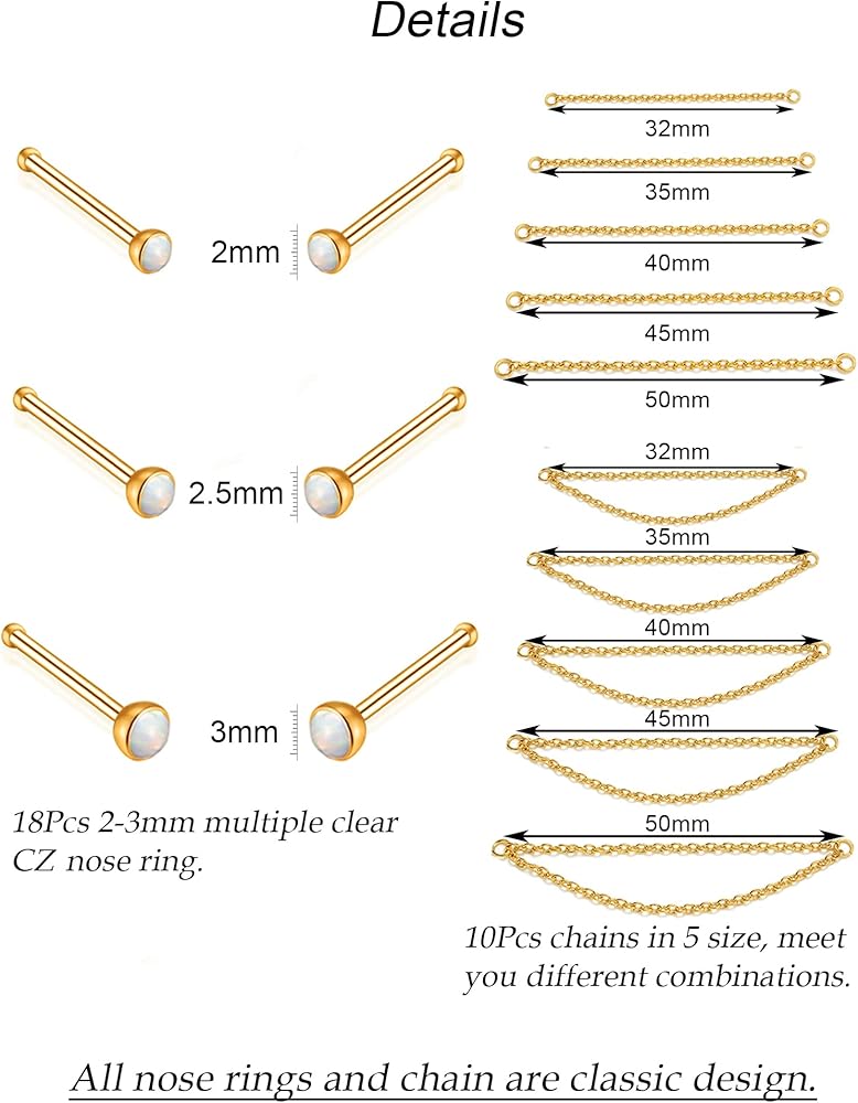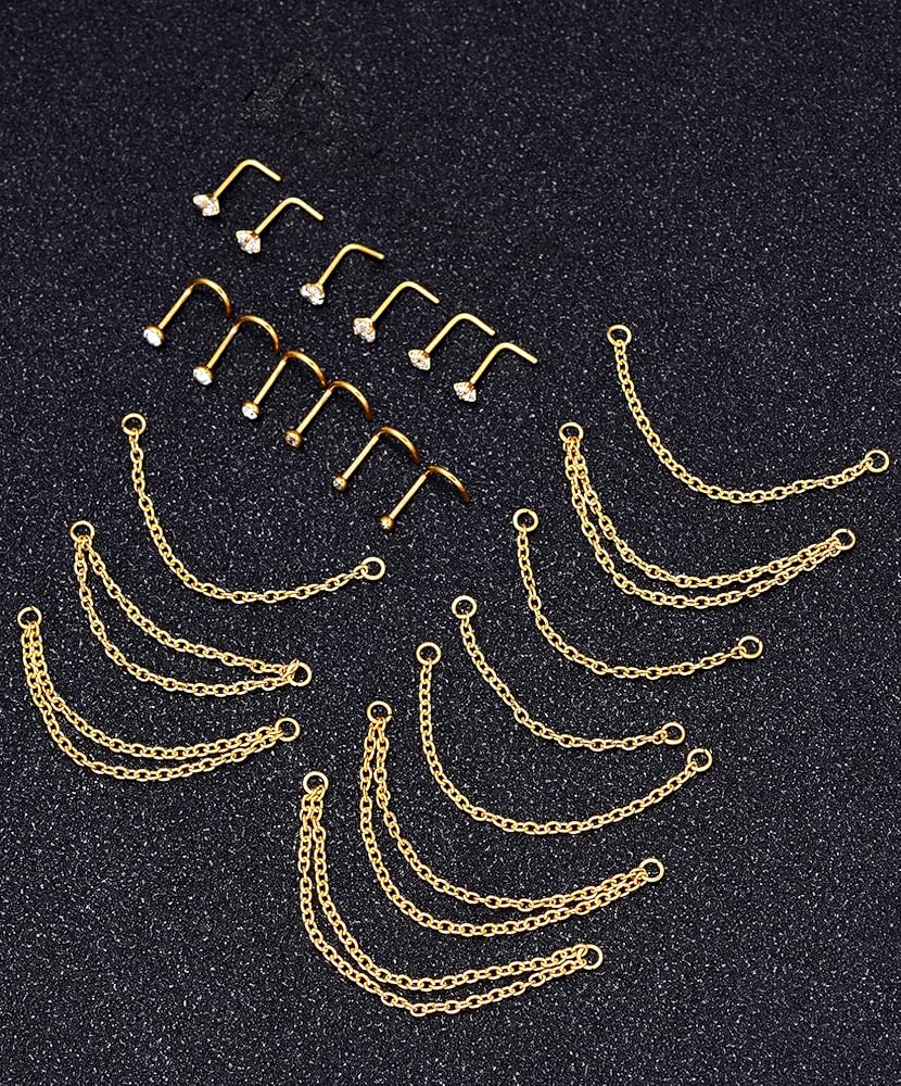 【سوف تحصل على: سوف تحصل على 28 قطعة من مسمار الأنف تتضمن 3 أزواج على شكل لولبي و3 أزواج على شكل مستقيم و3 أزواج على شكل حرف L و5 قطع سلسلة ذات سطح واحد و5 قطع سلسلة ذات سطح مزدوج، أضف لمسة من السحر إلى أي ملابس ذات قلادة طويلة.