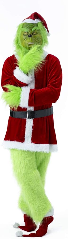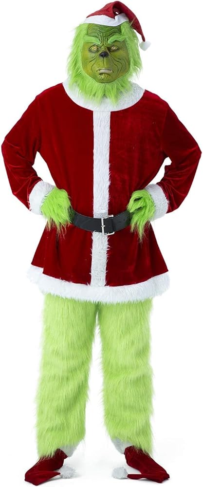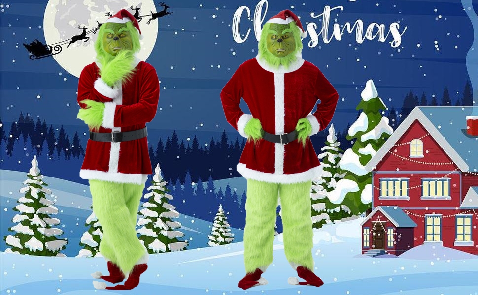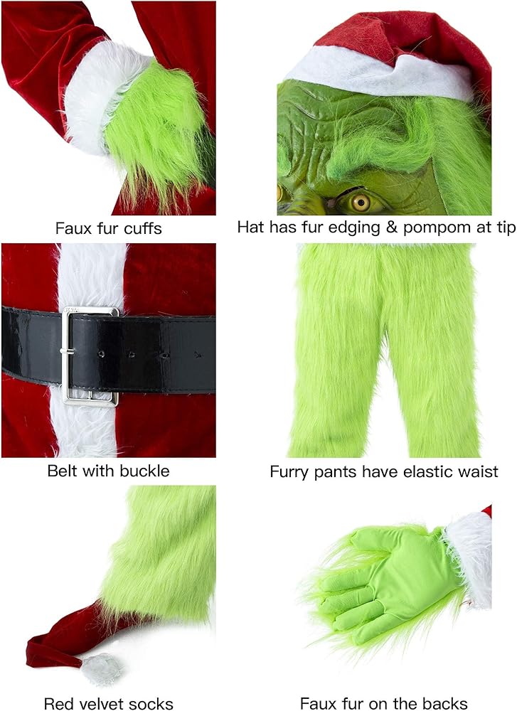 خامة فائقة الجودة - مجموعة كاملة من زي سانتا الخاص بنا مصنوعة من مواد عالية الجودة، وقناع كامل مصنوع من اللاتكس غير السام، وقفازات خضراء غامضة، وسروال مريح من الفرو، كل هذه تجمع بين مجموعة الأزياء المكونة من 7 قطع؛ إنه زي تنكري ولكن يمكن مقارنة الجودة بشكل إيجابي بملابسك اليومية ويمكنك استخدامه عامًا بعد عام.
