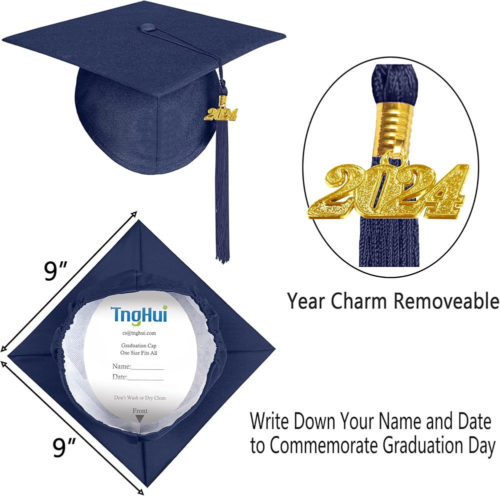 • What You Get: 1 Graduation Gown only + 1 Graduation Cap+ 1 Graduation Tassel with removable 2024 year charms (If you received the wrong year charm, please contact us to arrange for you.)