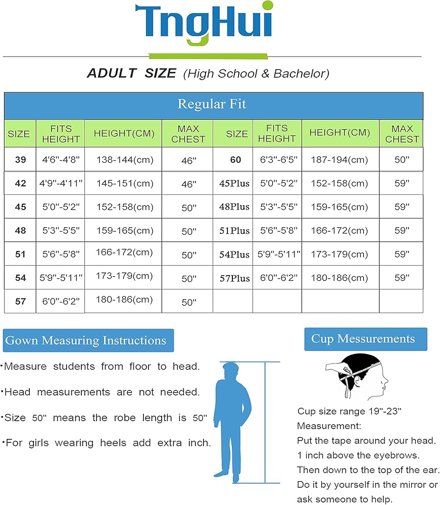 Tnghui has designed this unisex graduation uniform for all high school and college students who have just completed their studies. 12 colors are available currently for choice Loose-fitting Style sized by height and chest New design with Gathering back and shoulder,Front pleats and side pleats and Open sleeves Hidden Zip closure is strong and easy to put on and off Top of Graduation Cap measures 9"x 9" With elastic bands adjusting range of 19"-23",one cap size fits all the graduation gowns Blank paper to write down your name and date to commemorate Graduation day . If you are not satisfied with the soft and durable fabric of your graduation gown, or if it does not suit you, please let us know We try our best to give you the perfect shopping experience!