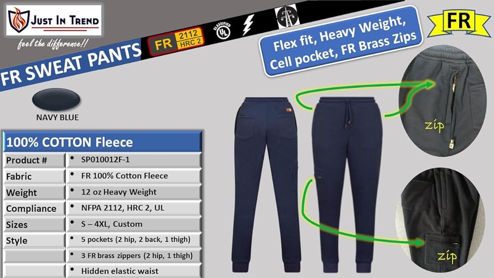 التصميم والمقاس: بنطال رياضي / بنطال الركض مع خصر مرن مخفي ورباط سحب إجمالي خمسة جيوب بما في ذلك جيبان جانبيان / الورك (مع سحابات نحاسية FR)، وجيبين خلفيين وجيب جانبي واحد للفخذ / جيب خلوي بسحاب نحاسي FR. إجمالي ثلاثة سحابات نحاسية مقاومة للهب من شريط Nomex ثقيل الوزن مصممة مع وضع السلامة والأداء والدفء والراحة والأناقة والقيمة في الاعتبار. تم تصنيعه وفقًا لمخططات المقاسات القياسية الأمريكية. ارجع إلى صورة جدول المقاسات.