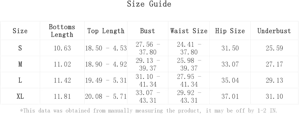 S:Bust:27.6-37.8IN,Top Length:18.5/4.5IN,Underbust:25.6IN,Bottoms Length:10.6IN,Hip Size:31.5IN,Waist Size:24.4-37.8IN