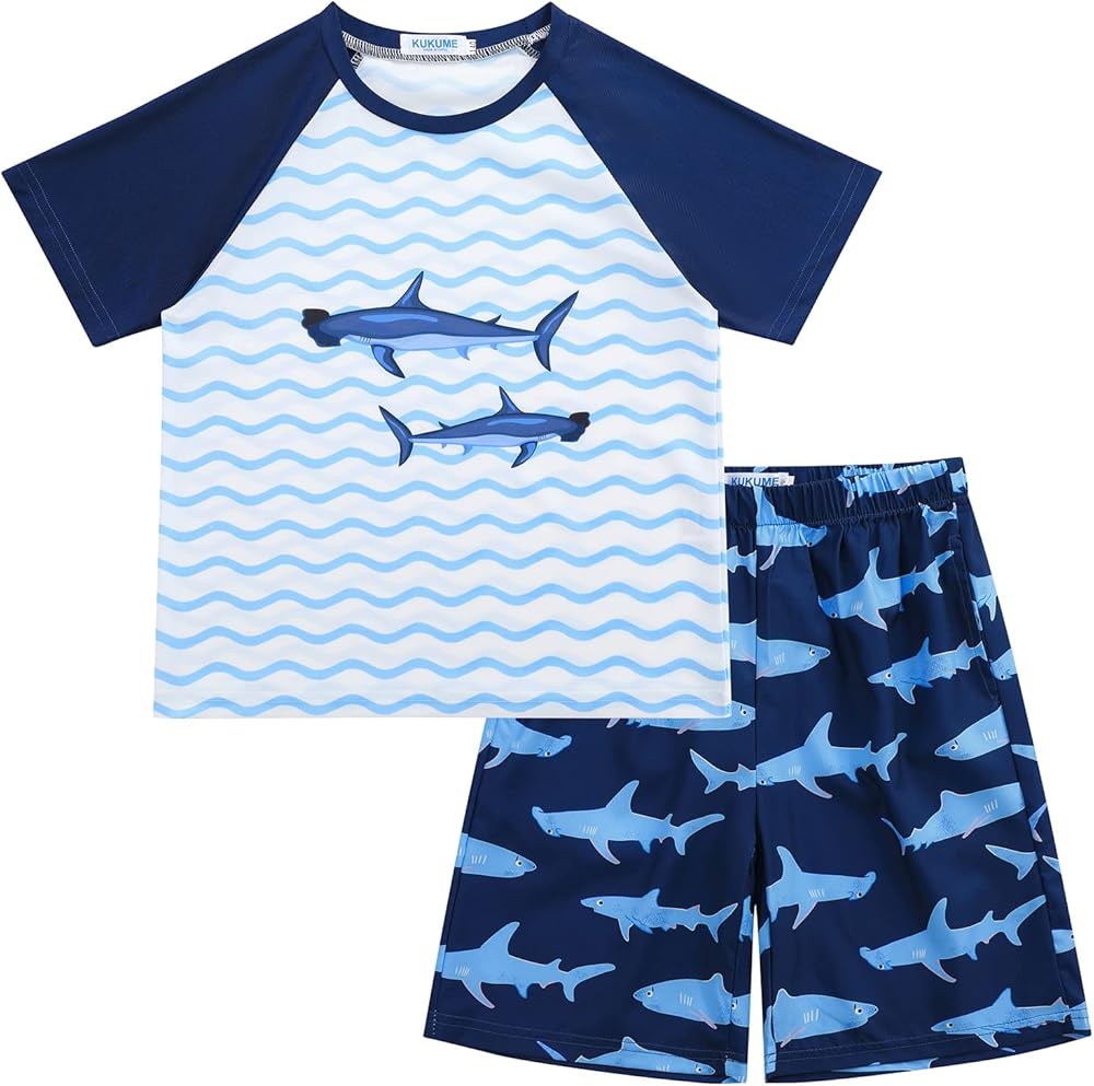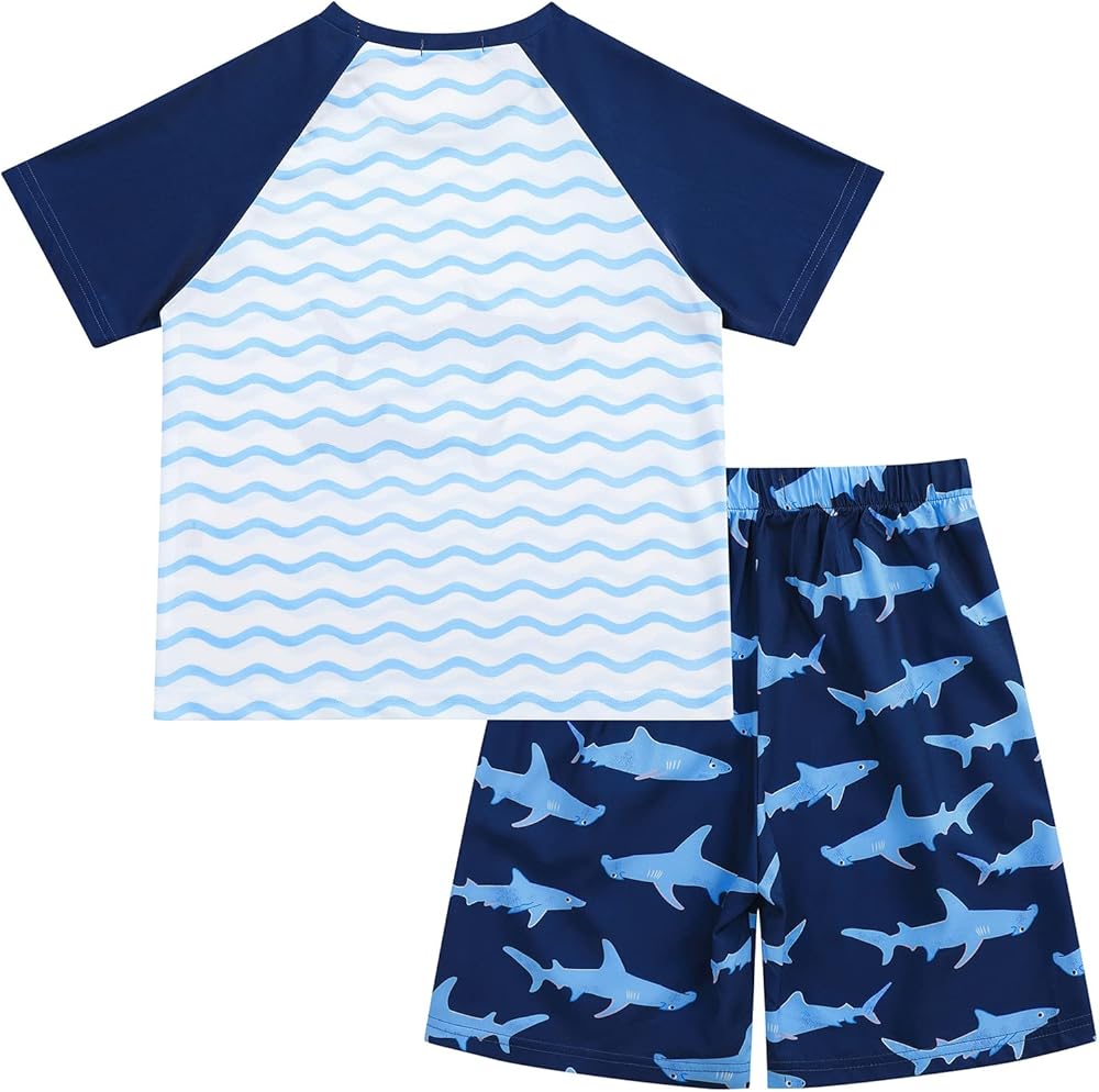 【🐬مجموعة ملابس سباحة للأولاد عالية الجودة】تشتمل مجموعة ملابس السباحة للأولاد هذه على قميص للحماية من الشمس وسروال سباحة مصنوع من نسيج عالي الجودة ناعم ومريح ومسامي ويمكن أن يحمي طفلك من التأثيرات الضارة للشمس.