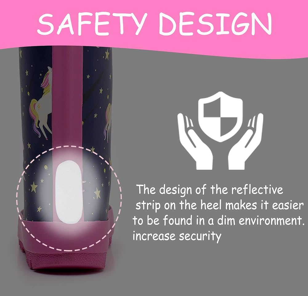 مقاومة للماء بنسبة 100% - تحافظ على جفافها وراحتها طوال اليوم، مصنوعة من مادة مطاطية طبيعية ناعمة ومرنة ومقاومة للاهتراء والخدش، تحافظ على نظافة الأطفال وجفافهم خلال موسم الطين والقفز في فصل الربيع مع الأحذية الطويلة، الجزء العلوي الناعم يجعل أحذية المطر سهلة التنظيف