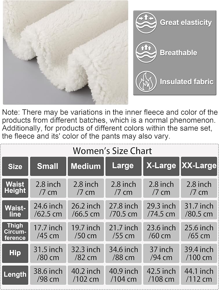 مقاسات مختلفة: هناك 5 مقاسات مختلفة لملابس الشيربا الحرارية الشتوية، تتراوح من الصغير إلى الكبير جدًا؛ مع مرونة كبيرة، فإن السراويل الضيقة المبطنة بالصوف تناسب بشكل مريح؛ يرجى الرجوع إلى جدول المقاسات الموجود في الصورة وتأكيد مقاسك قبل الشراء؛ ملحوظة: قد تكون هناك اختلافات في الصوف الداخلي ولون المنتجات من دفعات مختلفة، وهذا أمر طبيعي؛ بالإضافة إلى ذلك، بالنسبة للمنتجات ذات الألوان المختلفة ضمن نفس المجموعة، قد يختلف الصوف ولون البنطال أيضًا