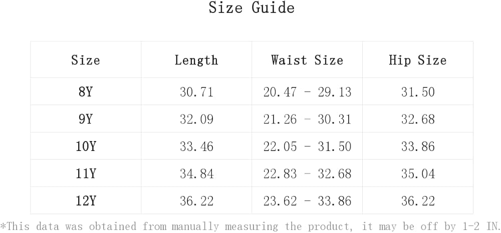 12Y:Hip Size:36.2IN,Length:36.2IN,Waist Size:23.6-33.9IN