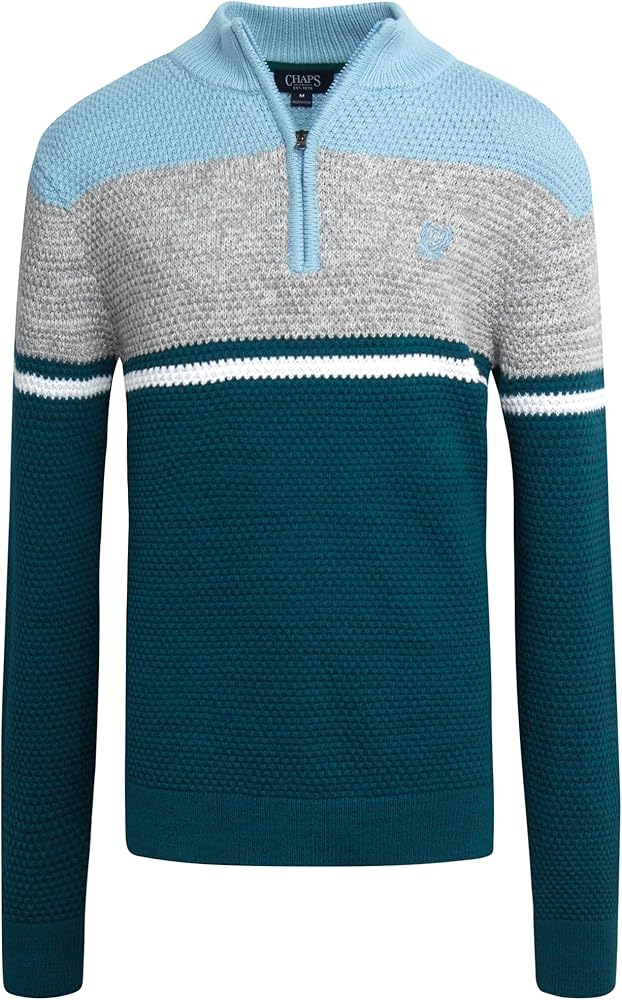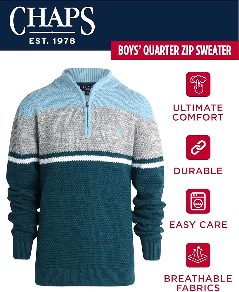 HIGH-QUALITY MATERIALS: Chaps is known for its commitment to quality, and this sweater is no exception; It's constructed from top-quality materials, ensuring it's soft against the skin and comfortable to wear all day long; The durability of this sweater makes it ideal for active young boys, withstanding their day-to-day adventures; With Chaps, you can trust in a brand that combines quality and style in each of its products, including this Quarter Zip Pullover Sweater for boys