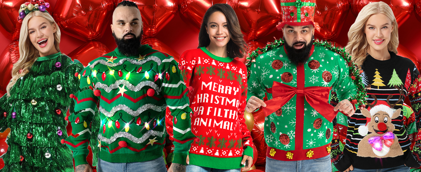 • الحجم المناسب. لضمان أفضل ملاءمة ممكنة لسترة عيد الميلاد المضحكة القبيحة الخاصة بك، نقدم عددًا من خيارات المقاسات من XS إلى XXL. لتجنب خيبة الأمل، ننصحك بشدة بمراجعة جدول المقاسات للعثور على المقاس المناسب وقياس نفسك حرفيًا باستخدام شريط القياس. مقاسات السترة ذات القلنسوة لدينا أصغر قليلاً من المقاسات القياسية
