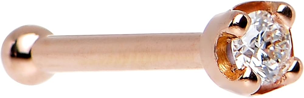 Genuine diamond nose ring. Artisan handmade 20 gauge 14kt rose gold nose bone with a 1.5mm prong set genuine diamond. Made in USA factory direct. Nickel gold body jewelry.. Specifications: 20 Gauge (.8mm), 1/4" (6mm), Solid 14kt Rose Gold, 1.5mm Genuine Diamond, SI1 Clarity, G Color, Prong-set, Handmade in USA, Hand polished. 14KT Rose Gold 1.5mm Genuine Diamond Nose Bone - 20 Gauge.