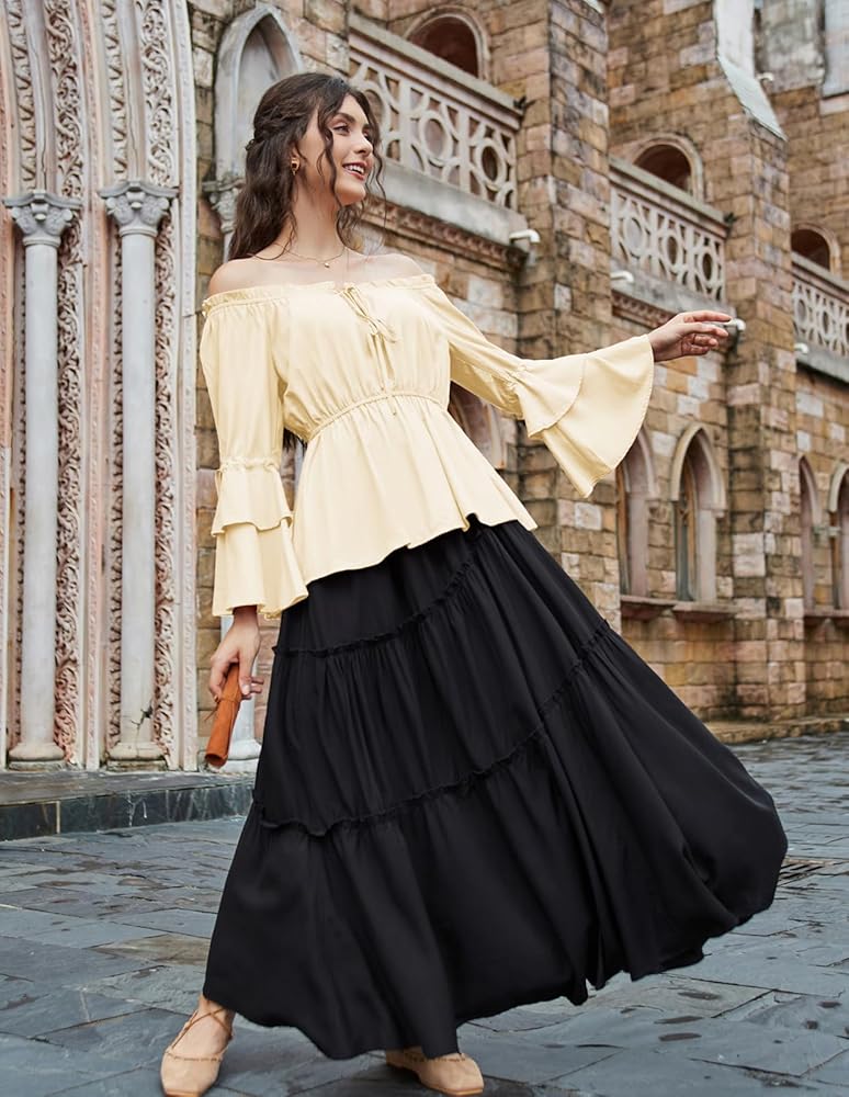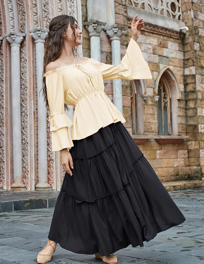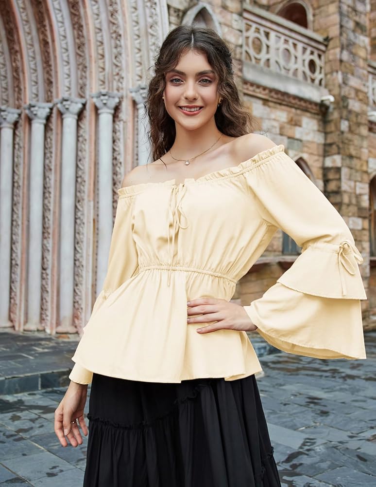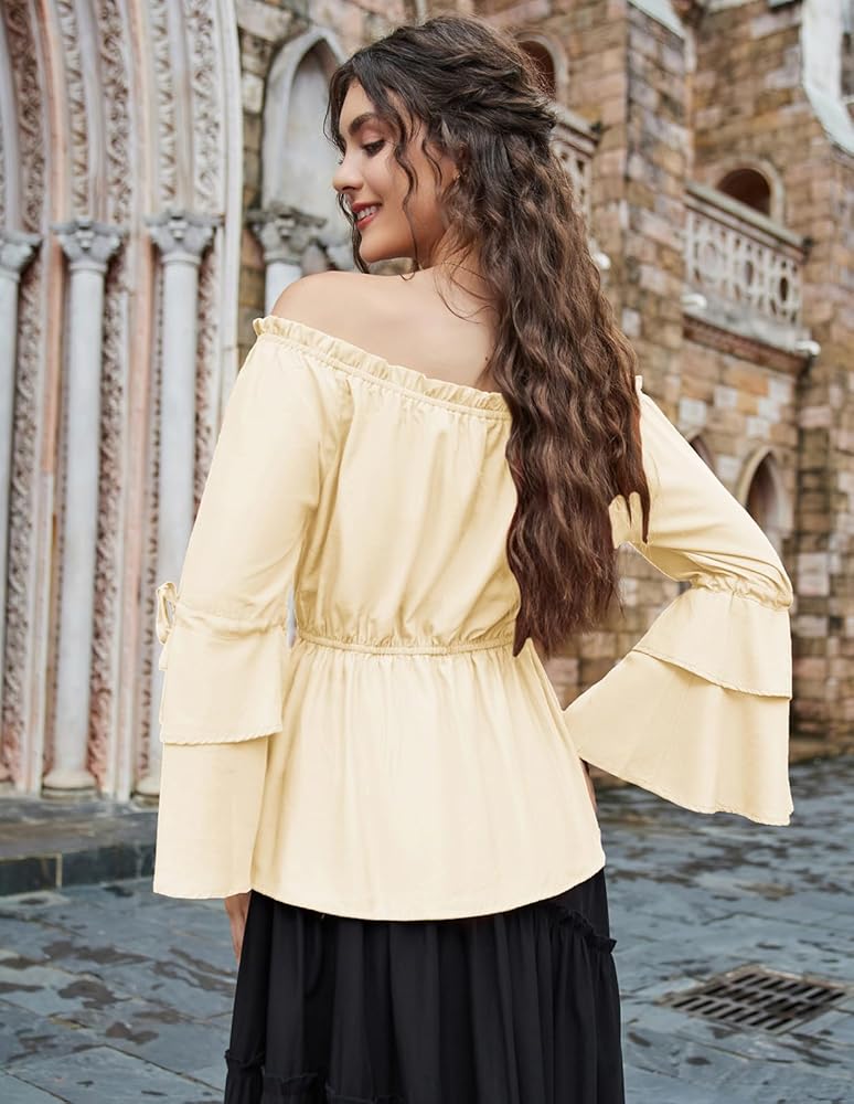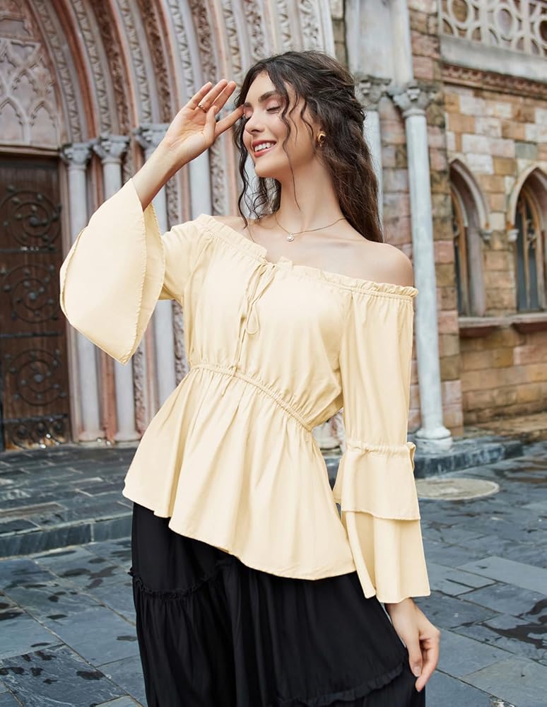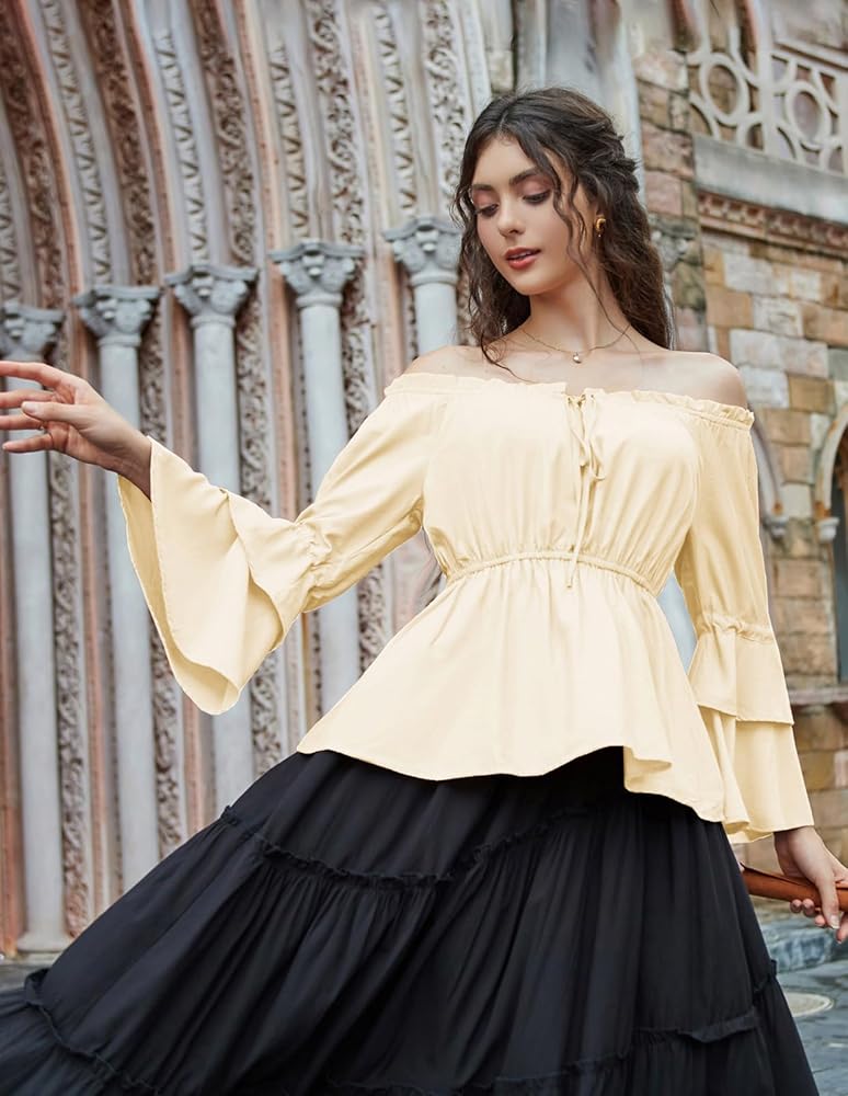 • 【مطابقة سهلة】يمكنك ارتداؤه مع مشد وتنورة من القرون الوسطى للحصول على مظهر زي في معرض عصر النهضة. رائع أيضًا لمطابقة هذا القميص ذو الأكمام الجرس بوهو مع السراويل القصيرة والسراويل الضيقة والجينز والكعب العالي للحصول على مظهر أنيق.