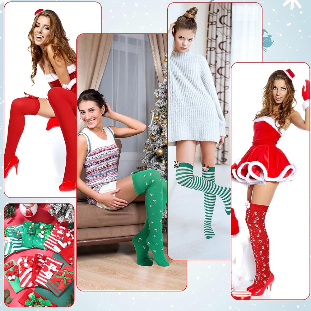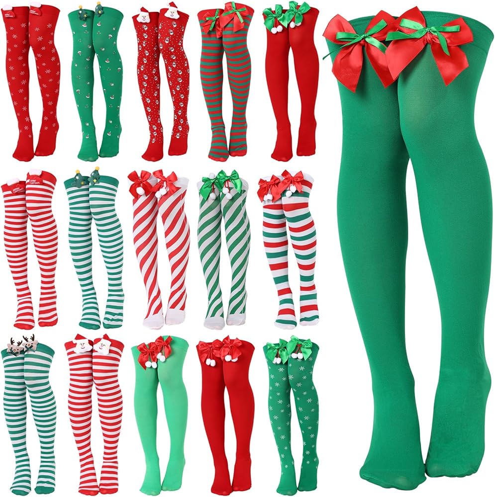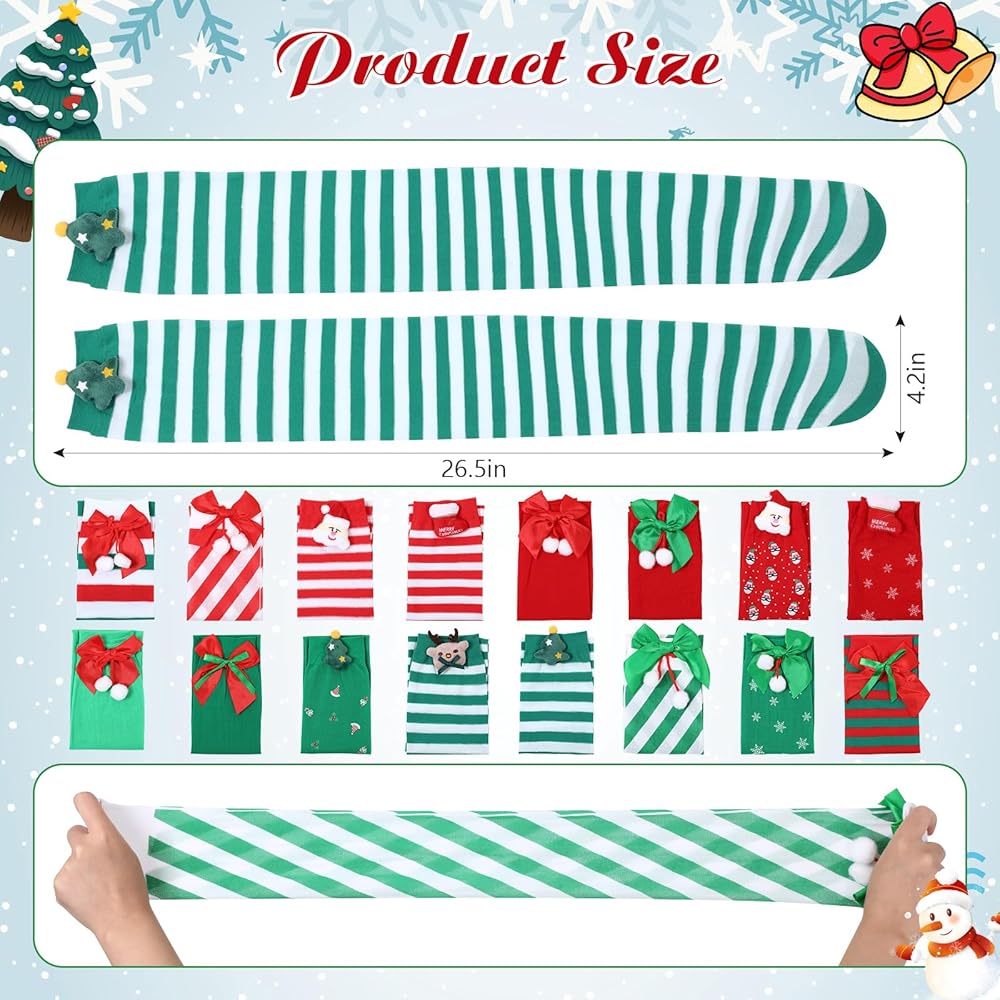 16 زوجًا من الجوارب الطويلة حتى الفخذ للكريسماس للنساء من واي اف اكس كيو واي اف اس اتش هذه الجوارب عالية الفخذ مصنوعة من قماش ناعم ومريح، قابلة للتمدد وجيدة التهوية، مقاس واحد يناسب معظم النساء والفتيات.