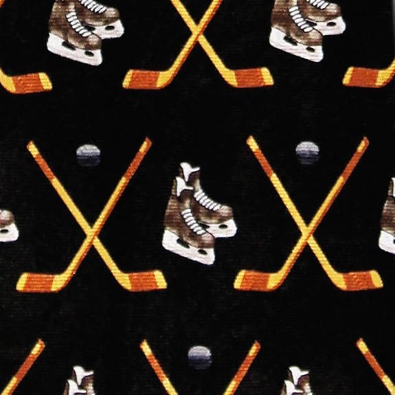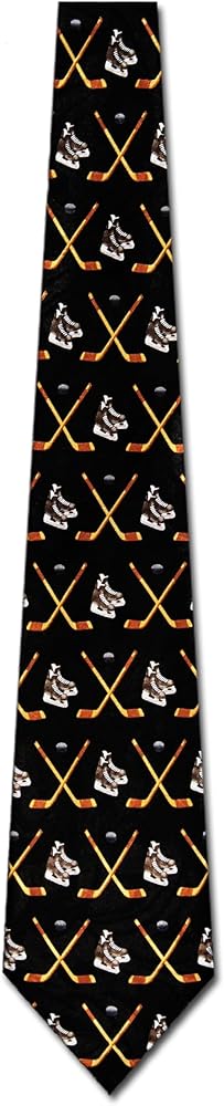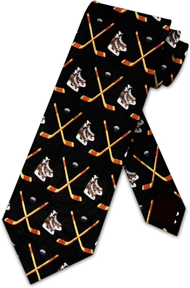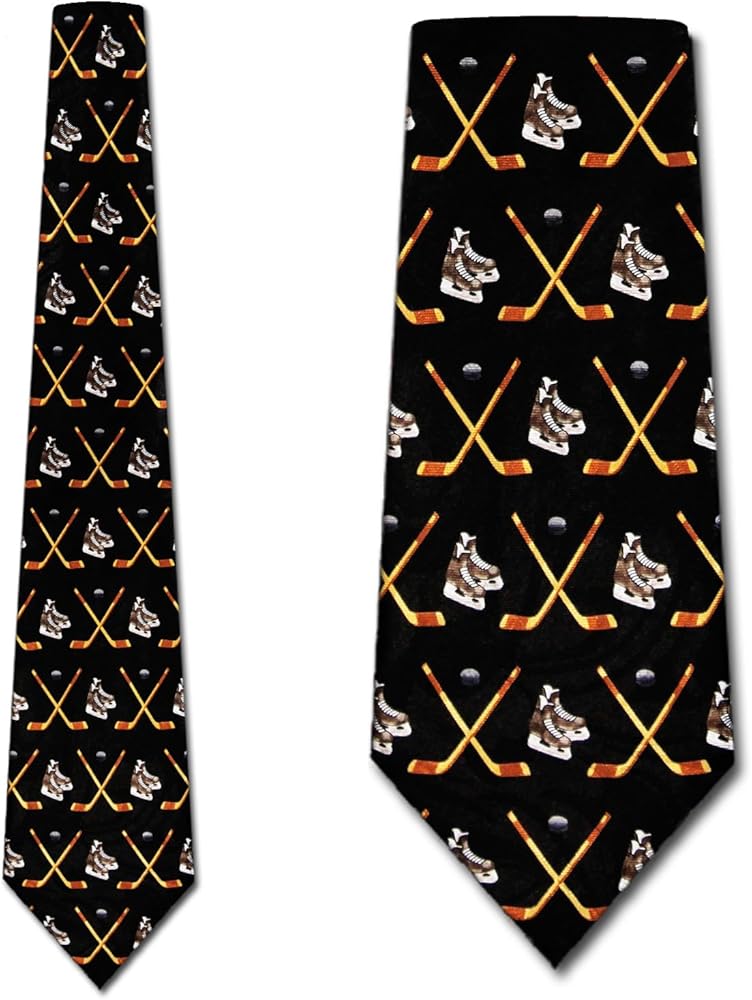- ربطة العنق لها نمط من أقنعة الهوكي والقرص وعصي متقاطعة.