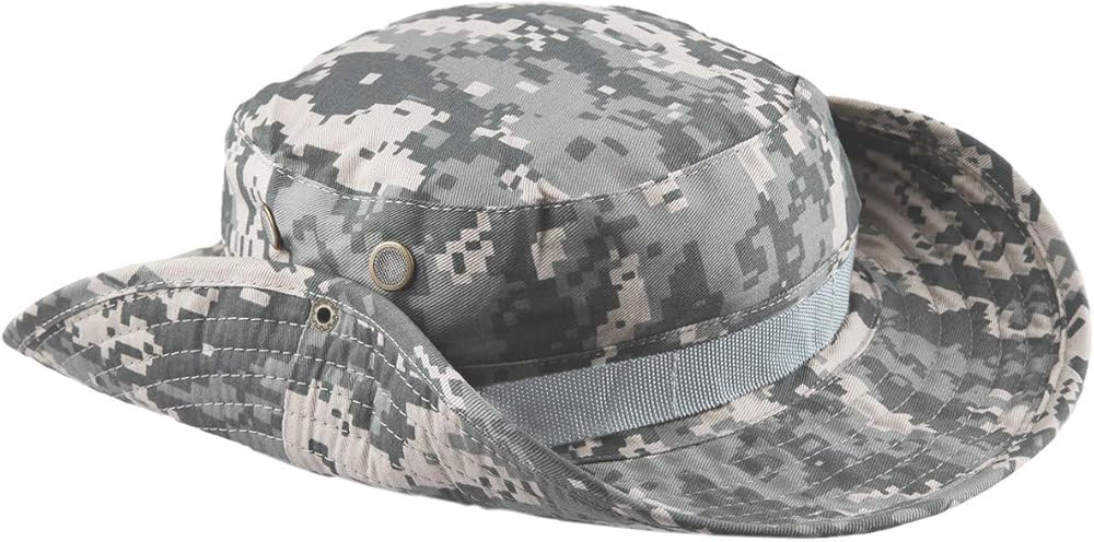 قبعة بوني مموهة عسكرية للرجال مقاومة للتمزق، قبعة كاو الغابة، مثالية للأنشطة الخارجية أو الرياضية، مثل صيد الأسماك والتنزه والتخييم وأعمال الفناء والإبحار وما إلى ذلك. فتحات التهوية على كلا الجانبين تسمح بدوران الهواء بينما يضمن حزام الذقن القابل للتعديل ملاءمة آمنة.