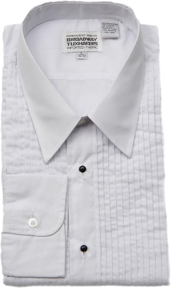 This is a men's, white tuxedo shirt with Lay Down Collar. It includes both black studs and regular buttons. Button cuffs can also use optional cuff links. This shirt is easy care permanent press, 35% cotton/65% polyester. This is the perfect shirt for a prom, wedding, cruise, or any other formal event.
