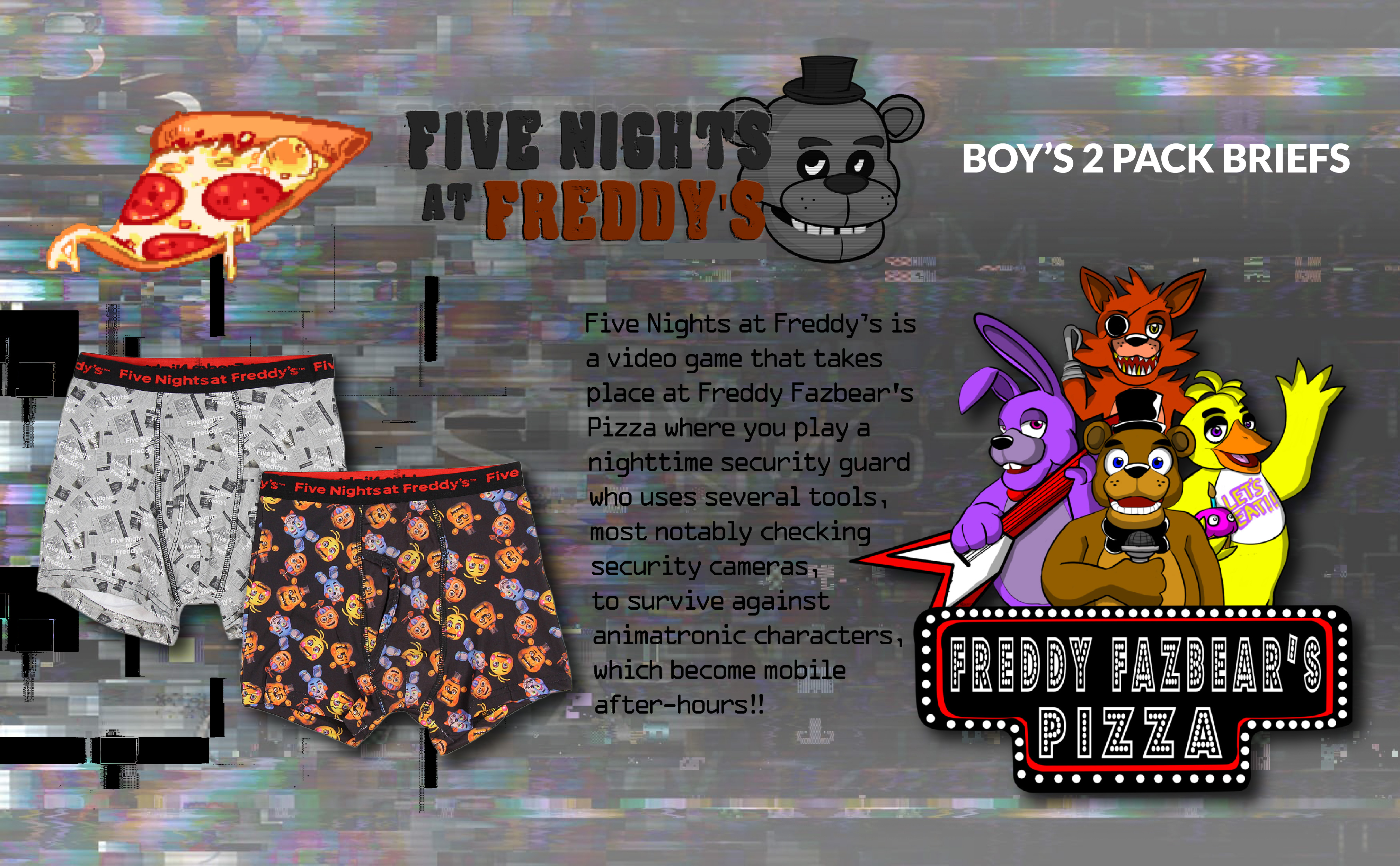 نبذة عن العلامة التجارية: Five Nights at Freddy هي لعبة فيديو تجري أحداثها في Freddy Fazbear's Pizza حيث تلعب دور حارس أمن ليلي يستخدم العديد من الأدوات، أبرزها فحص كاميرات المراقبة، للبقاء على قيد الحياة ضد الشخصيات المتحركة، التي تصبح متنقلة وقاتلة بعد- ساعات. تتميز بشخصيات: فريدي، تشيكا، بوني وفوكسي. البيجامات متوفرة بناتي واولاد.
