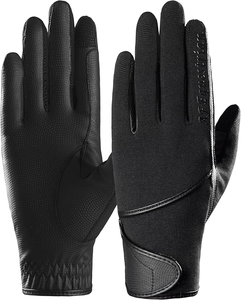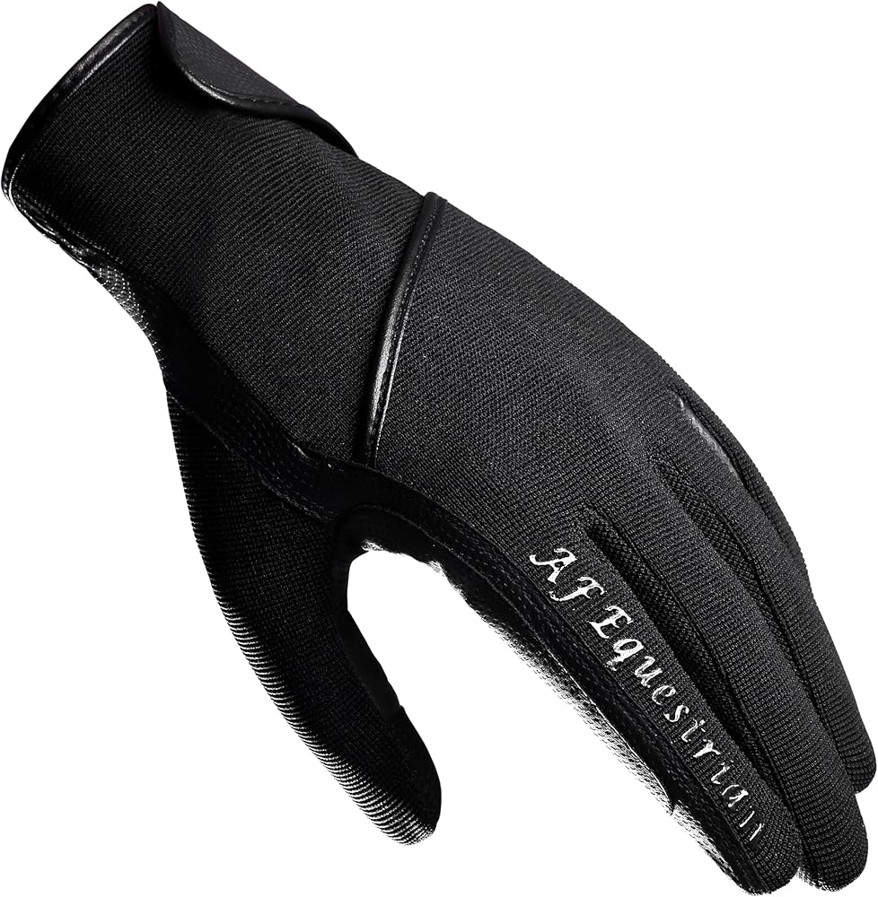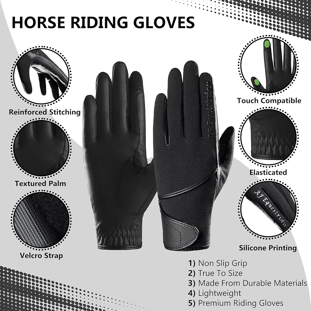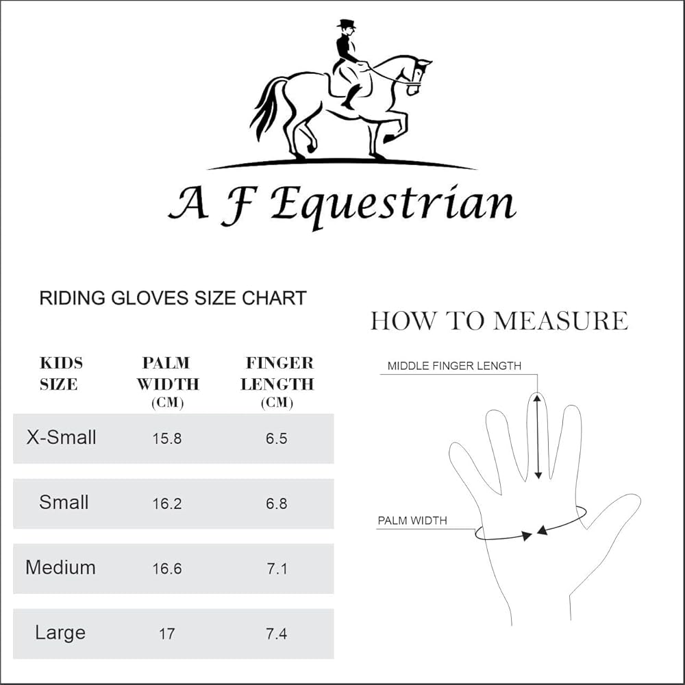 Kids Horse Riding Gloves Childrens Pony Riding, Bike, Gardening Outdoor Mitts/Gloves Try these Equestrian Gloves for an Ultimate Grip & Ride!! AFE Kids Equestrian Gloves can also be used for Bike Riding, Gardening and other Indoor & Outdoor Activities. Breathable & Stretchable: Back of the Hand is made from a Stretchable & Breathable 4-Way Fabric Hi-Tech Synthetic Leather Palms: Available in Black Colour these gloves have Synthetic Leather Palms for great grip and protection in all weathers. Velcro Closure: Easy On/Off adjustable wrist closure ensuring optimal fitting for boys & girls. Lightweight & Comfortable: Soft cloth lined edges for superior wear comfort. Easy to fit in pockets and bags. Reinforced Stitching: Double layer kids gloves with reinforced stitching for easy and tight holding of the reins. We are confident that these gloves will please in every aspect if for any reason you are not satisfied with your purchase simply return the gloves unused within 30 days of purchase for a refund!!!