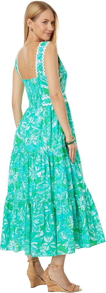 Lilly Pulitzer Pollie Cotton Midi Dress is a stylish addition to the closet and makes a perfect pick for casual or special outings. Regular fit. Pullover style. Wide shoulder designer straps. Square back. On-seam side pockets. Pleated design allover. Flowy hemline. Material:Body: 100% cotton;Lining: 100% cotton. Machine wash, dry flat. Imported.