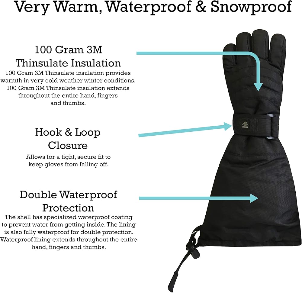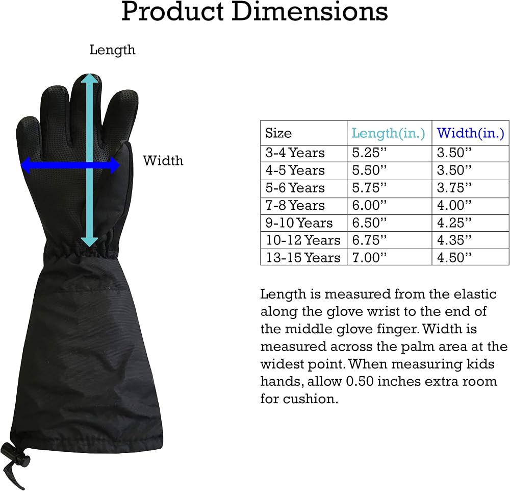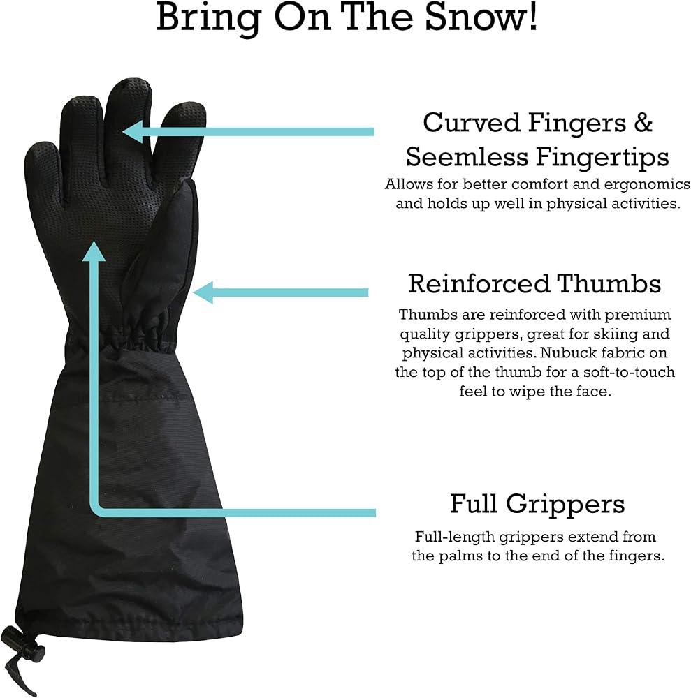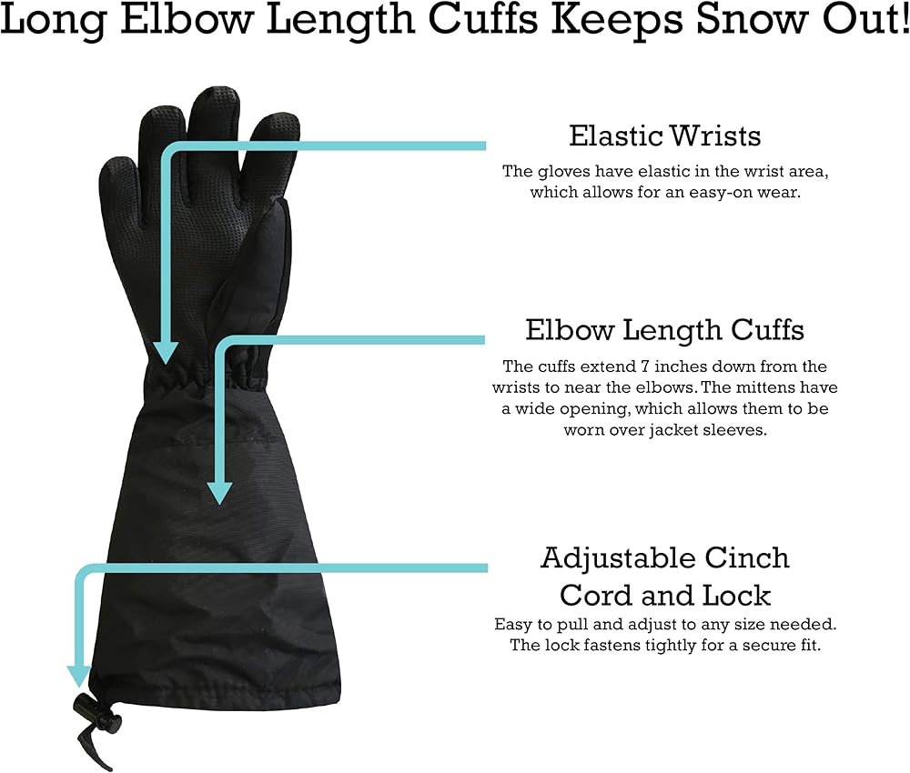 LONG ELBOW LENGTH CUFFS KEEPS THE SNOW OUT: The gloves are designed with a long extra length cuff that extends to your child's elbows. The cuffs open wide and have a draw cord with lock, so they can be worn over or under a coat sleeve. The gloves are fully waterproof and will keep kids hands dry in wet and snowy conditions.