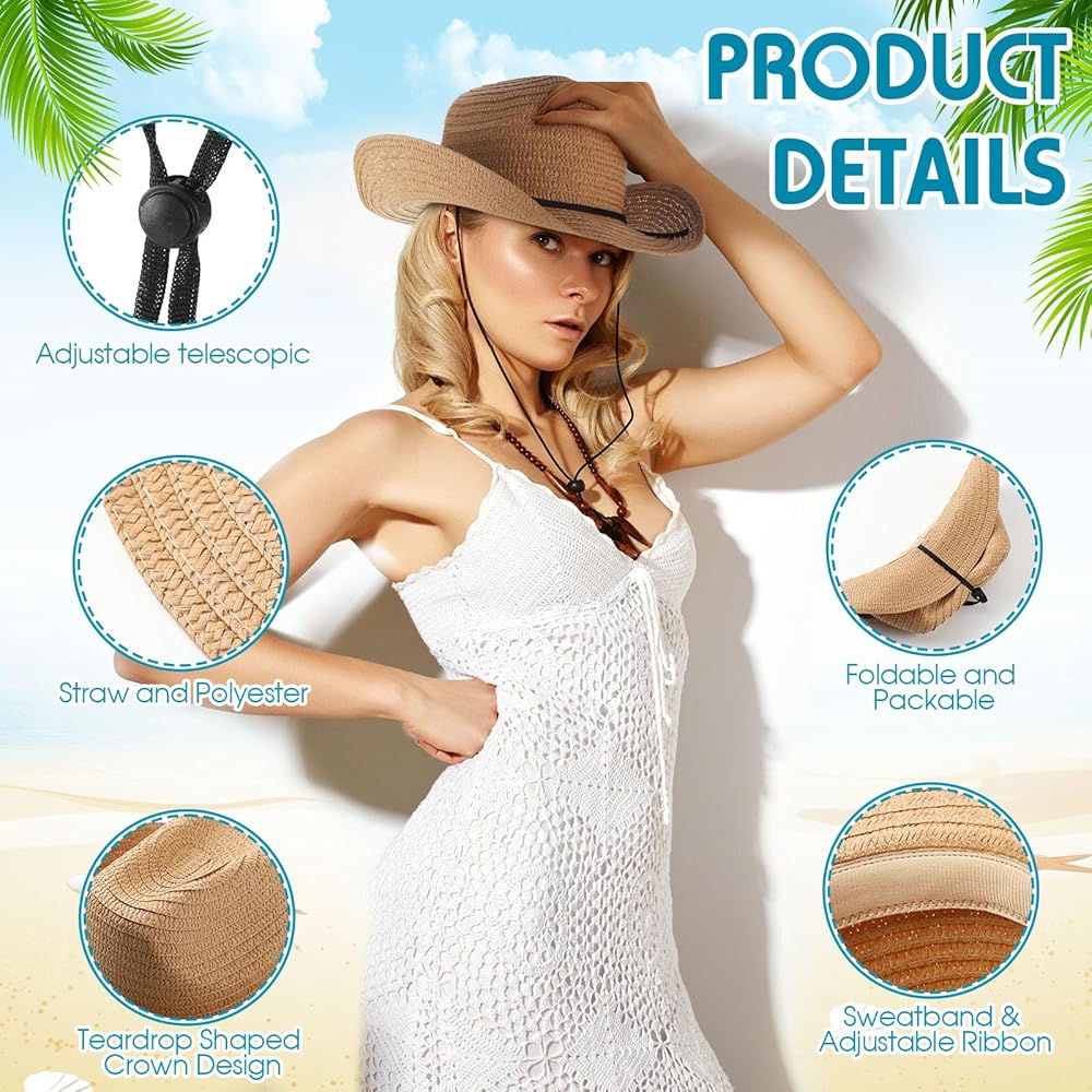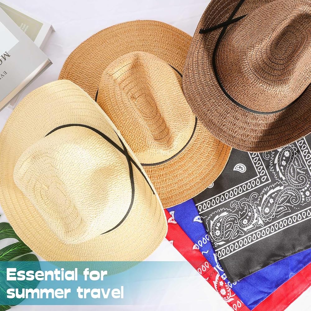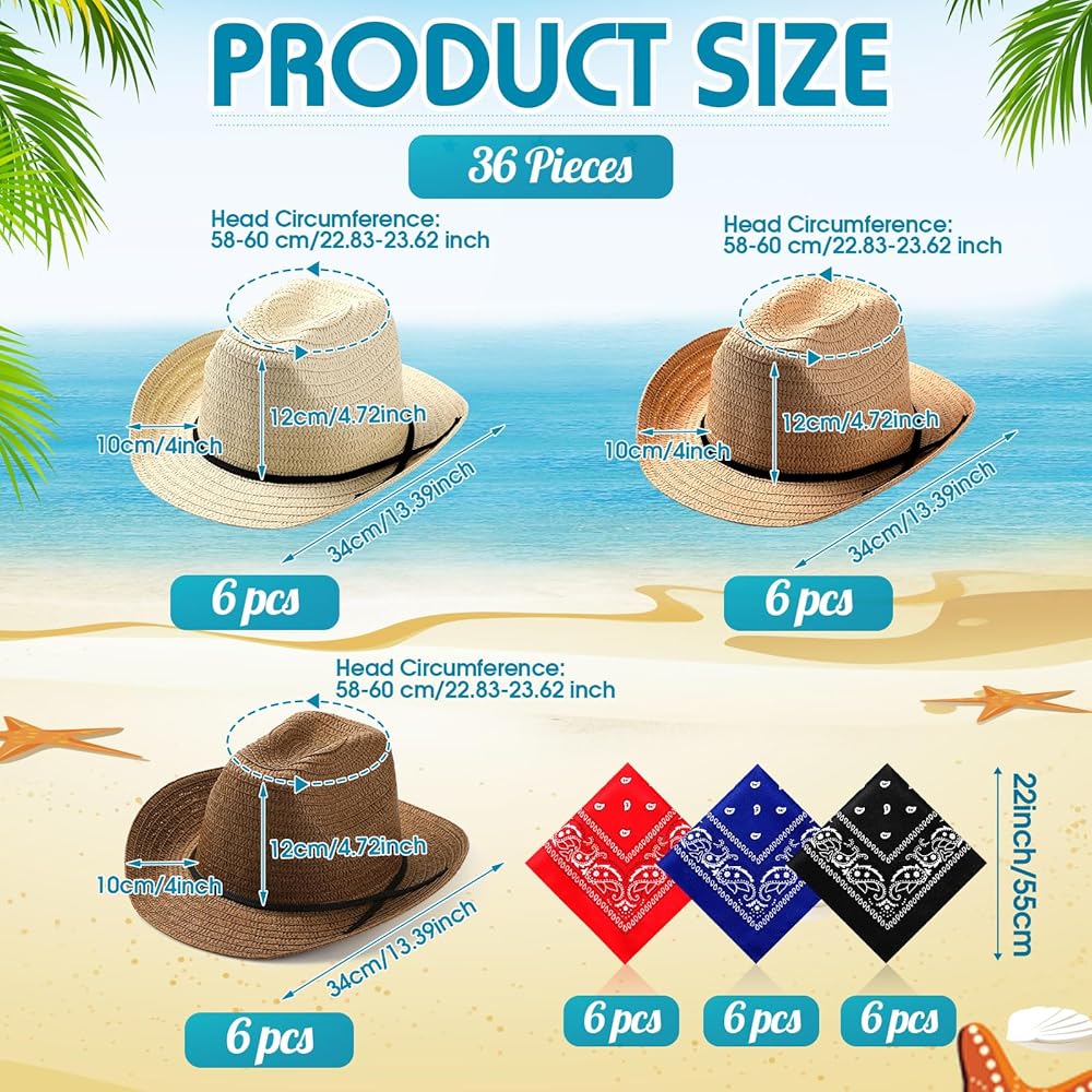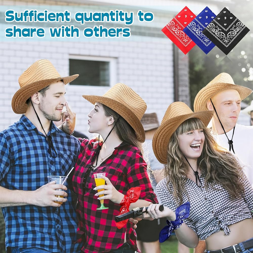 خفيفة الوزن ومريحة: قبعة رعاة البقر مصنوعة من ماصة ورقية عالية الجودة، مسامية ويمكن تظليلها، ويزن حوالي 91 جرامًا، خفيفة ومريحة في الارتداء؛ المناديل المربعة مطبوعة بأنماط بيزلي كلاسيكية، وهي مناسبة كإضافة إلى ملابس رعاة البقر
