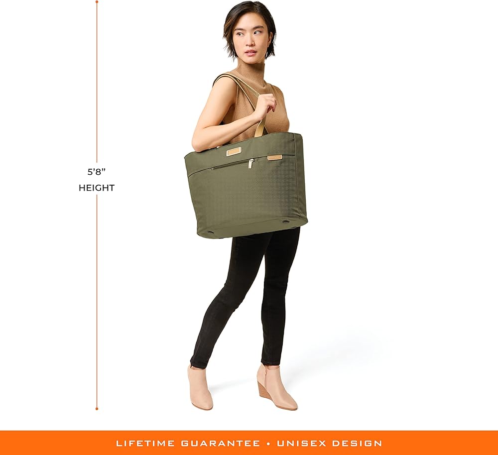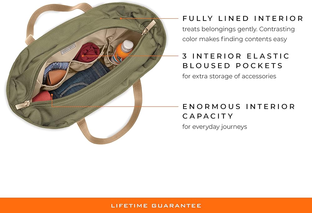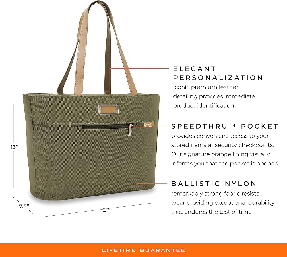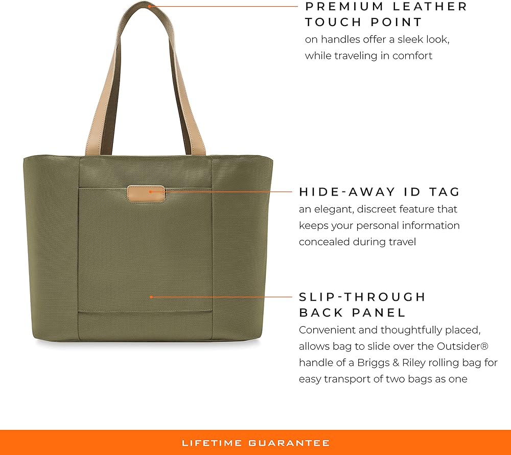 The Briggs & Riley Tote bag (13" x 21" x 7.5") offers spacious capacity, allowing you to fit it all. The premium leather touchpoints on the top carry handles add comfort and style to your travel. Tote Bag can be cleaned with a soft, damp cloth or an adhesive lint brush roller. If your bag is ever broken or damaged, we'll repair it free of charge, no proof of purchase needed, no questions asked.